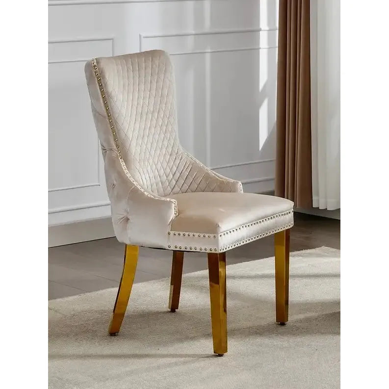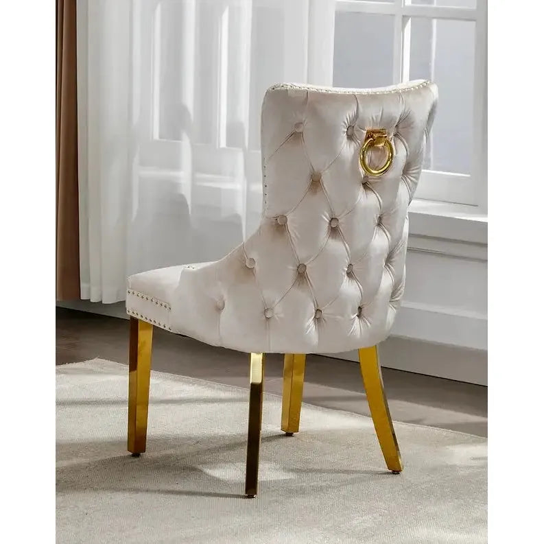 This isn’t just a chair. It’s the spotlight of your dining space. Meet the velvet dining chair with knocker—where comfort meets luxury. Wrapped in plush creme velvet, it feels just as elegant as it looks. The deeply tufted back adds texture and depth, while nailhead detailing offers that extra pop of sophistication. The polished gold frame is sleek and modern. But it’s the oversized back knocker that steals the show. It’s bold. It’s glamorous. And it makes a statement from every angle.