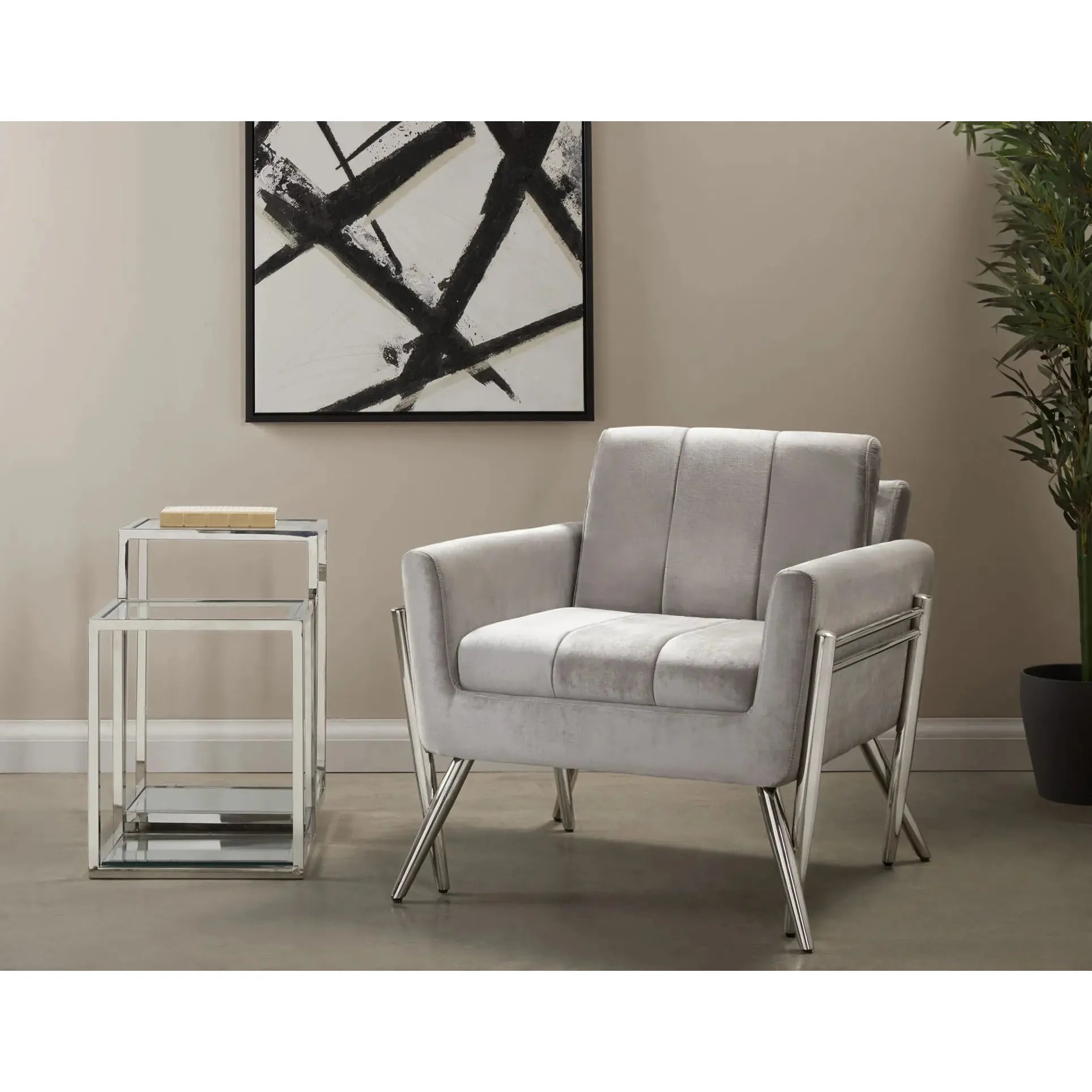 Modern Grey Velvet Accent Chair with Criss-Cross Polished Steel Legs