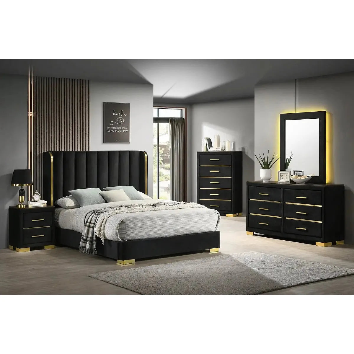 At the heart of the collection is a black velvet tufted headboard with striking gold accent wings. It’s bold. It’s elegant. And it brings that unmistakable luxury-hotel vibe into your own space. No box spring is needed thanks to the platform bed design, giving it a clean and modern profile.