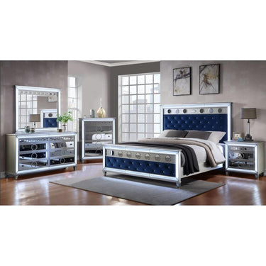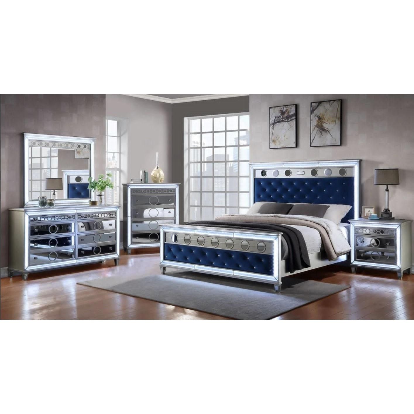 The Mairead set leans hard into its glam-inspired aesthetics. The button tufted headboard and footboard feature bold colors while surrounded by glowing LED lights. Mirror accents grace the panels of the bed and each of the case goods’ drawer faces. Serving as a vanity replacement for your bedroom, light bulbs row the top edge of the matching mirror. On the night stand is a handy wireless charger, allowing you to charge your gadgets as you prepare for a fancy night out in town.