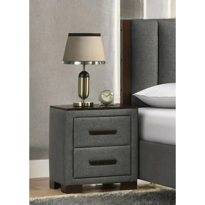 Designed with tropical wood veneers and dark grey upholstery, it’s as sturdy as it is stylish. The vertical pattern headboard adds a soft, contemporary touch, while the warm brown wood accents balance the look with natural character. Adjustable headboard height (45–49”) means you can set it just right for your space.