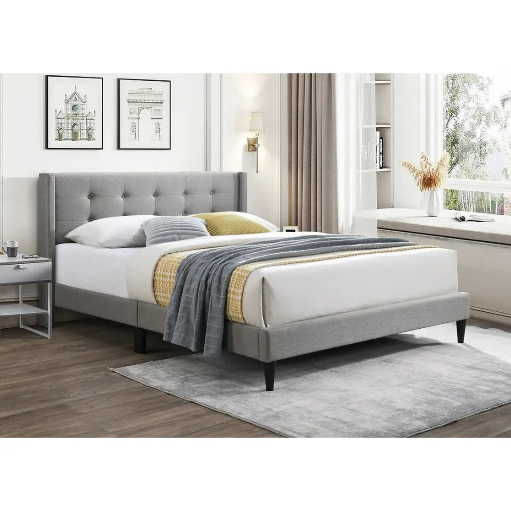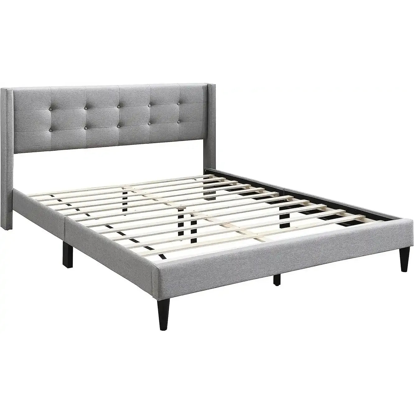 Grey King Bed with Tufted Wing Headboard & Mattress Support