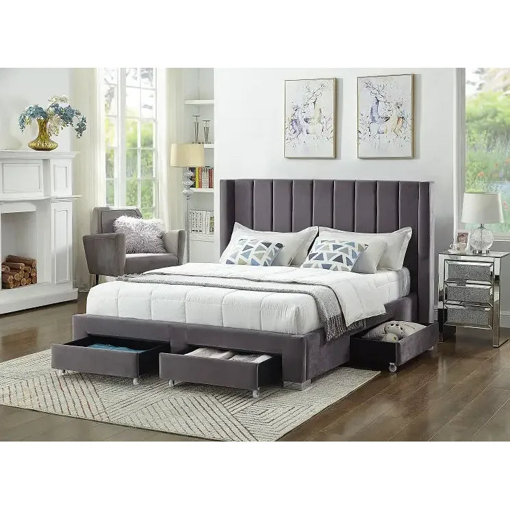King Storage Bed with Drawers – Velvet Wingback Tufted Frame
