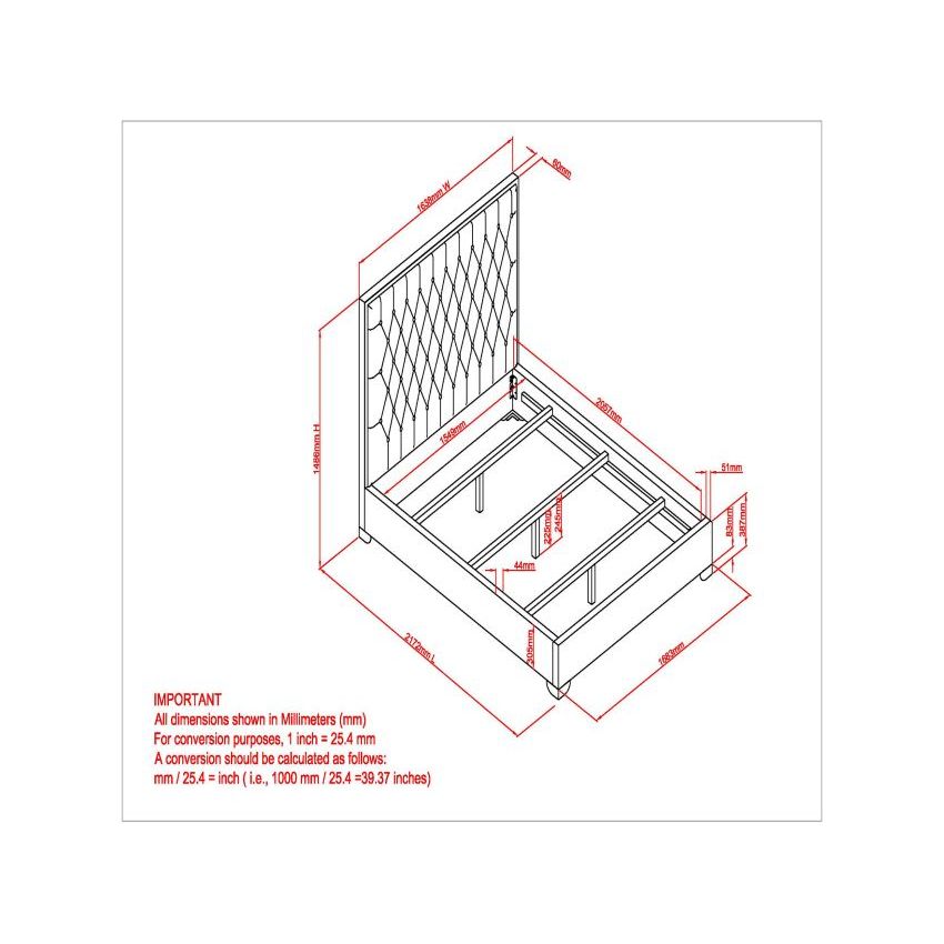• Diamond Tufted Headboard – Tall headboard with smooth reflective stainless steel in gold finish frame.