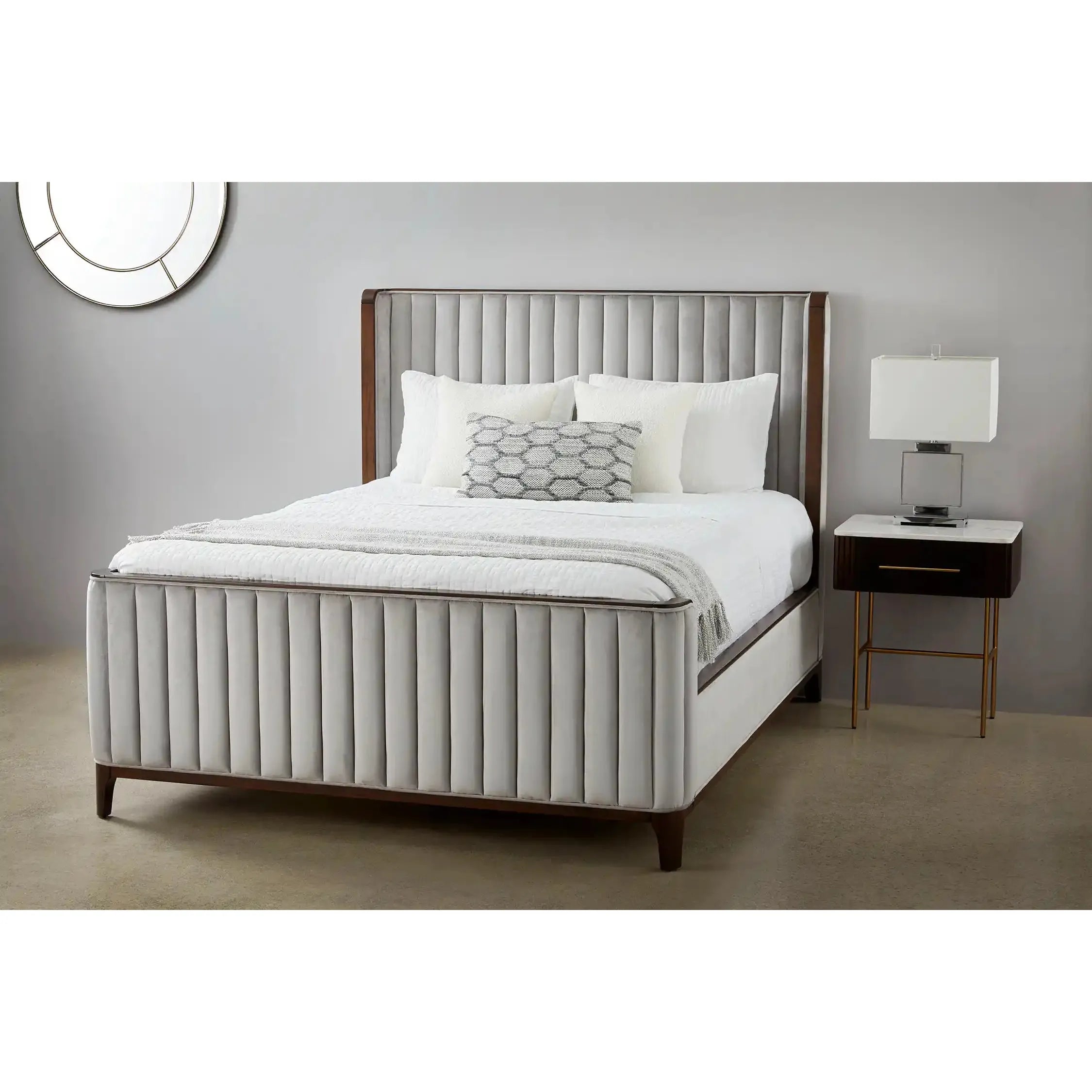 Add a stately look to your bedroom with the Majestic Velvet Queen Bed, where traditional style meets cutting-edge design. Wrapped in a luxurious grey velvet diamond button, tufting extends from the towering headboard spacious frame to the splendid footboard high arching cabriole legs with a rich dark wood finish complements the stunning button tufting on this upholstered bed with oversized bed bench — the stunning beauty showcases the Hollywood glamour framing curved double bed headboard and the precisely carved cabriole feet provide a solid base to this pretty and opulent bed. The classic nailhead trim offers a timeless finish, and elevated wood legs add just enough height. Assembled to catch the eye and made for everyday comfort easily, this bed is delivered with multiple slat supports and a set of hardware ready to improve your well-rested life upon exciting unboxing. It is ideal for high-end interior spaces and comes in queen or king sizes, making bedroom design easy.