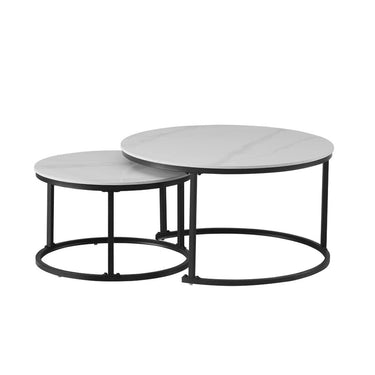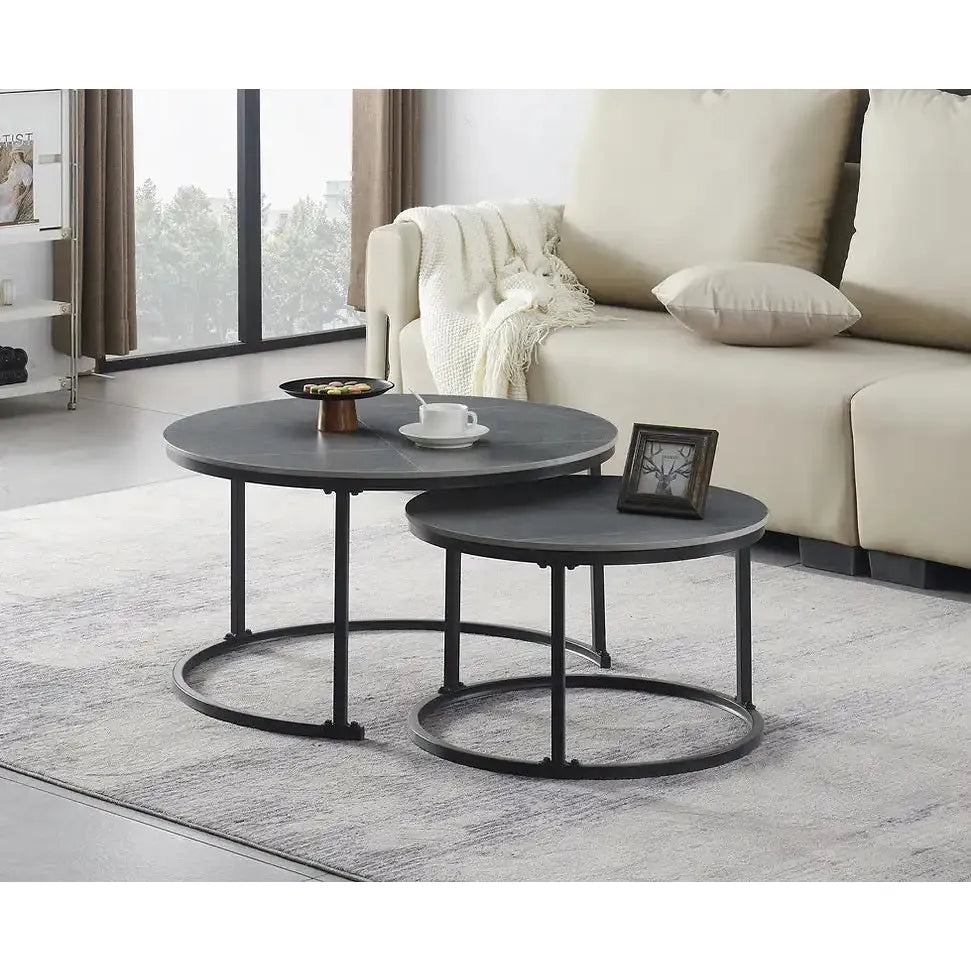 Set of two round coffee tables with marble tops and black metal frames Set of two round coffee tables with marble tops and black metal frames