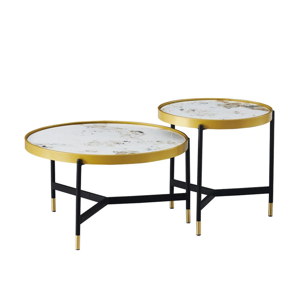 Add a spark of modern elegance to your living room. This set of 2 coffee tables is the perfect blend of style and functionality. The luxurious Pandora sintered stone tops offer a marble look with unmatched durability—resistant to stains, heat, and scratches. The round design softens your space while the sleek black and gold steel base adds contrast and a high-end vibe.