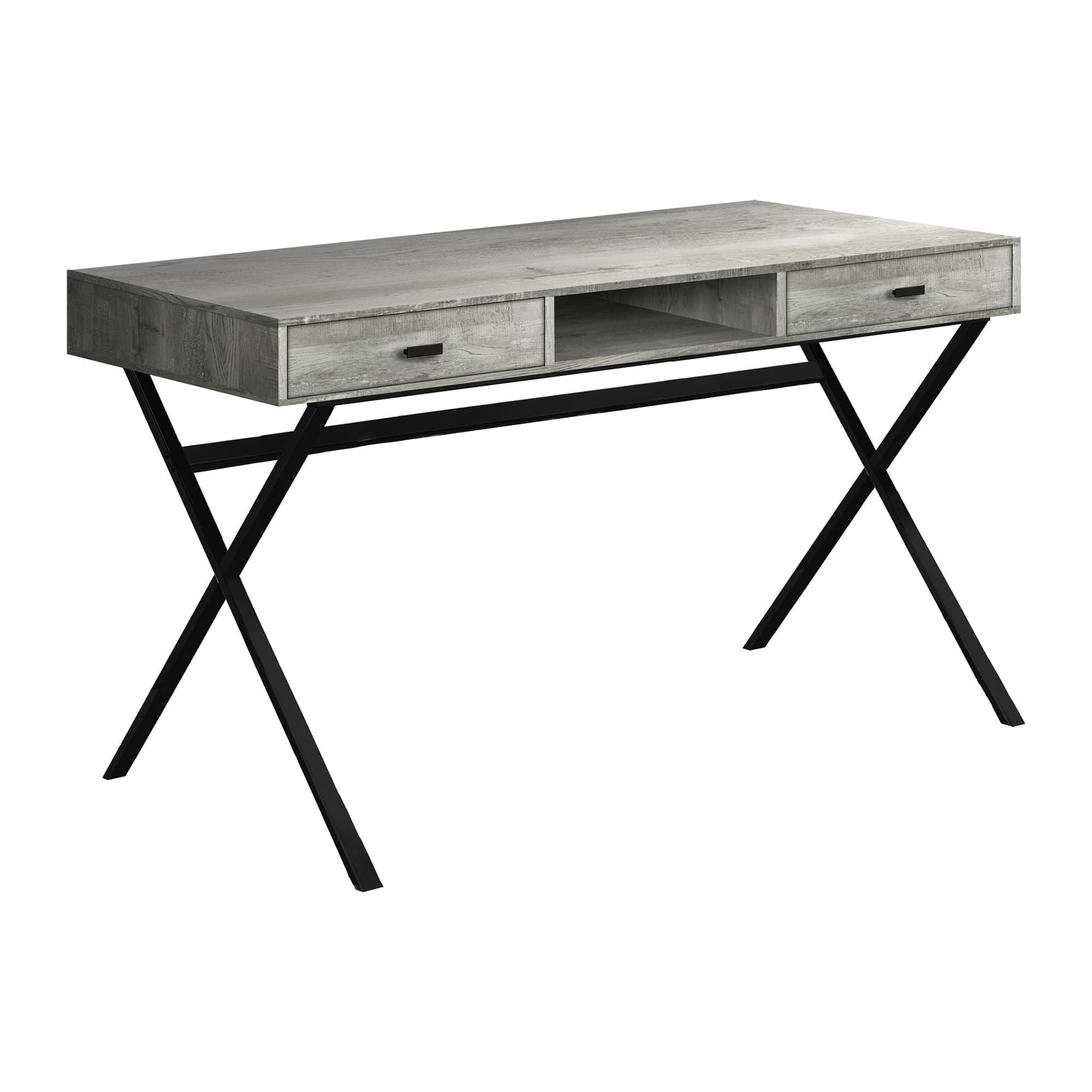 This industrial-style desk is finished in a grey reclaimed wood. The Grey reclaimed wood desk is equally functional as a computer desk, writing table, or study desk. This Compact office desk is perfect for small homes or apartments. The black metal X-design base ensures stability and a comfortable work environment. This office desk has two easy-open storage drawers for all you need to store away while not in use.