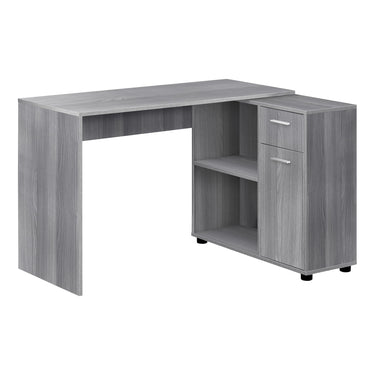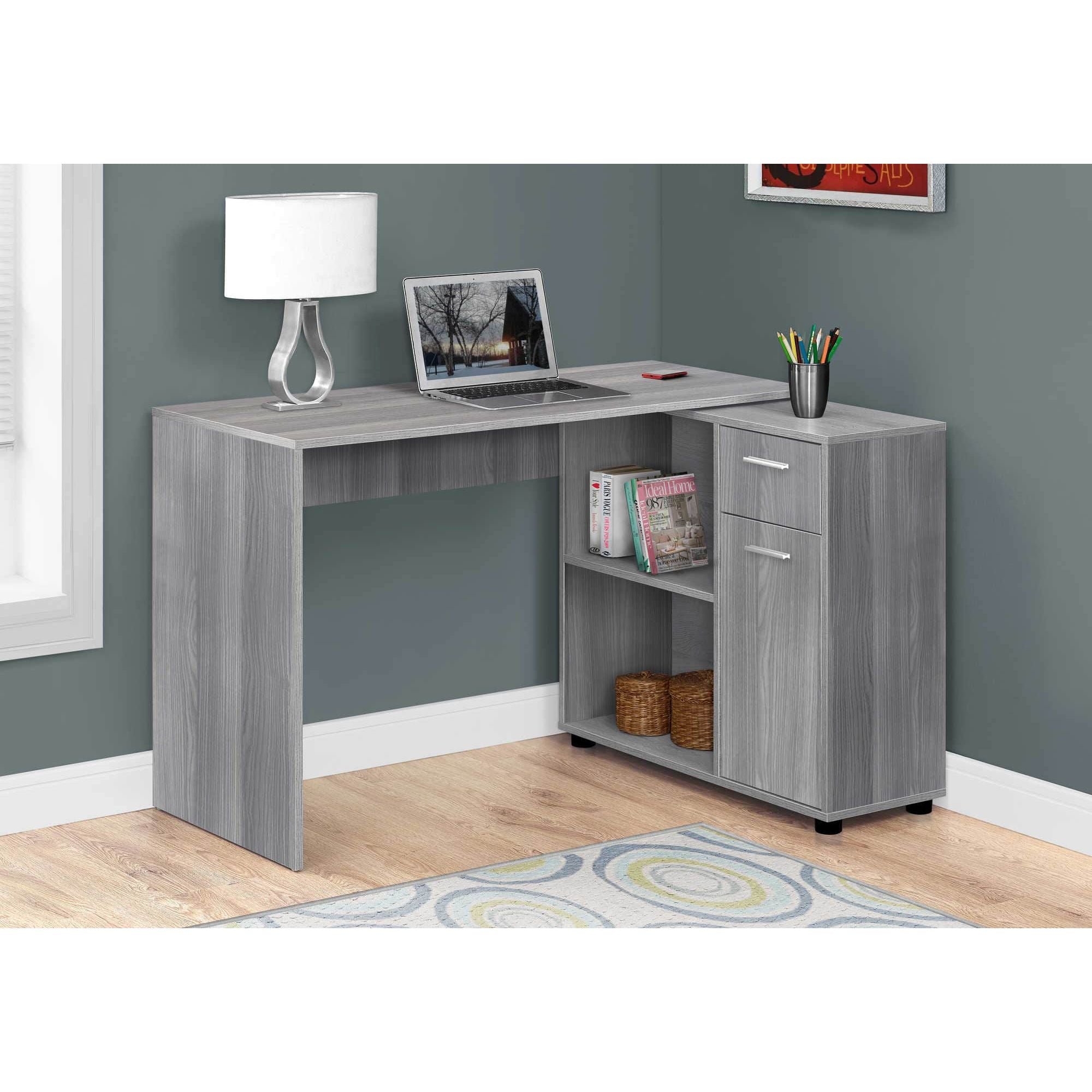 With built-in storage, this L-shaped grey color computer desk is perfect for students or home offices. It has two cubbies with one fixed shelf panel, one drawer, and one perfectly-sized cabinet. This space-saving computer desk is finished in a grey wood-look laminate. This grey corner computer desk is intended for placement in a corner but can be positioned anywhere in the room.