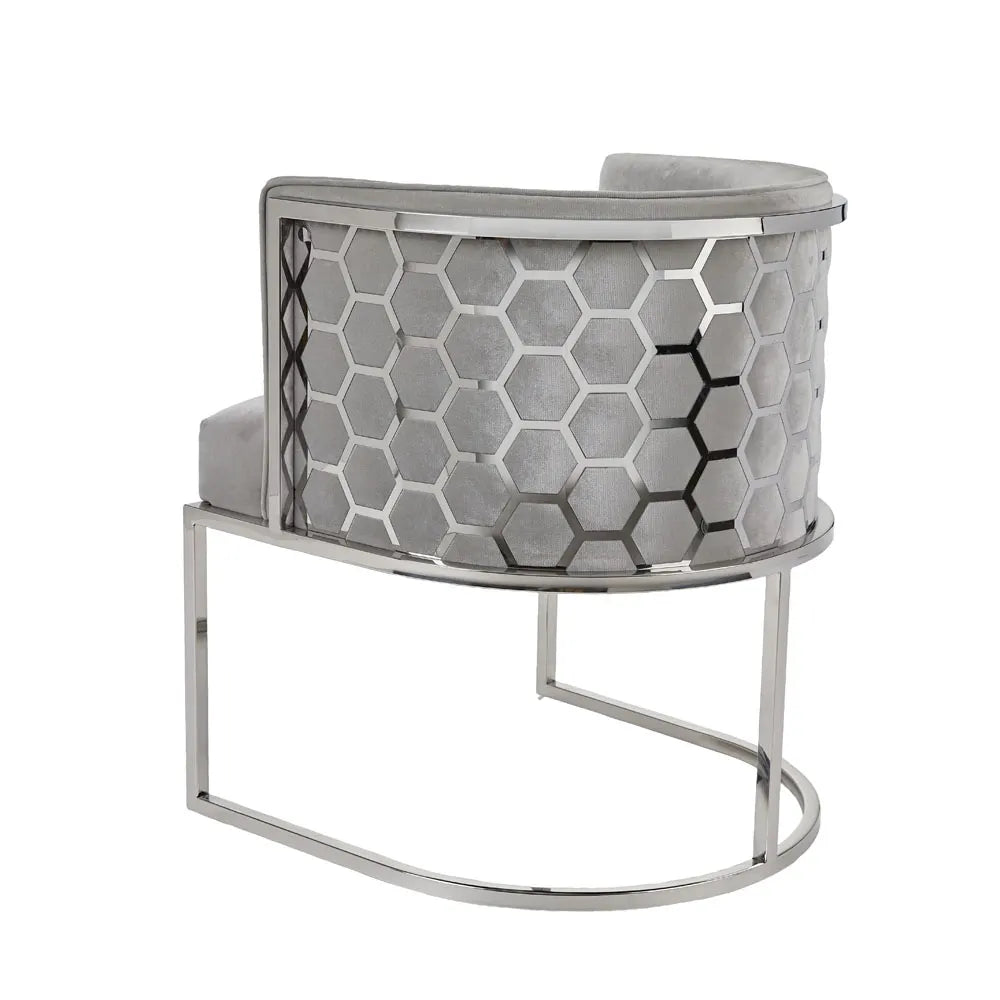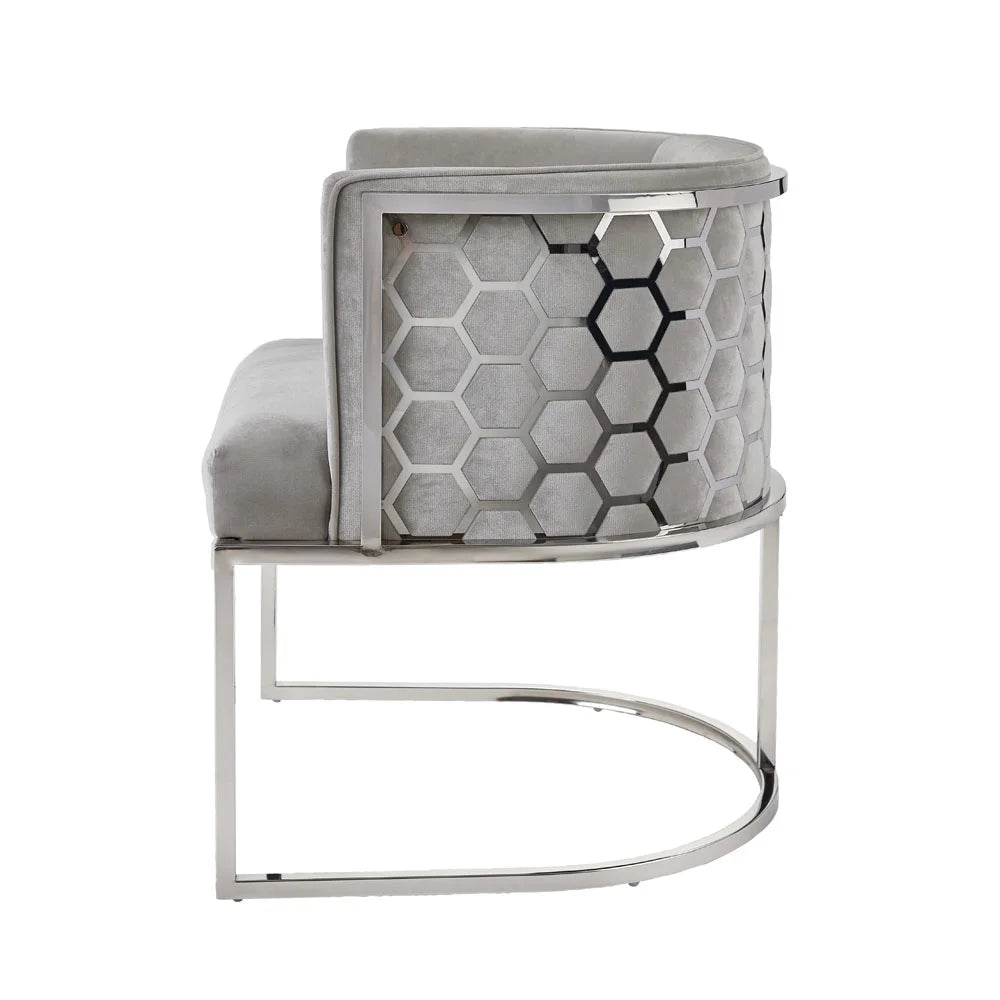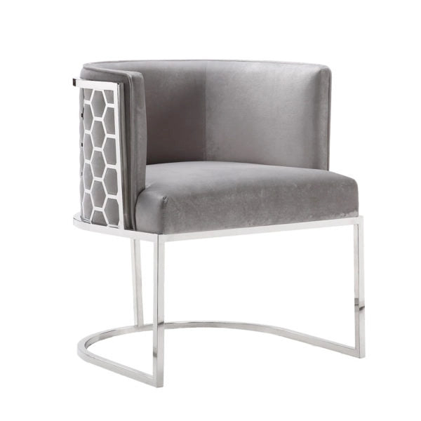 Make a bold statement with how you work and play with the Chamberlain grey velvet dining chair, where sophistication meets a touch of modern edge. The chair is wrapped in striking grey velvet polyester fabric, and the unique honeycomb laser-cut seat and back perch on a tall , polished stainless steel base.