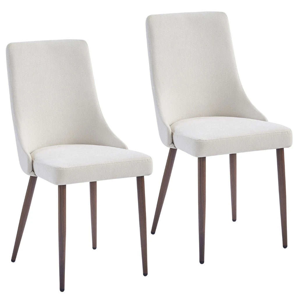 Create a sophisticated and inviting dining area with the Cora mid-century fabric dining chair set of 2. Simple yet stylish design, this set of 2 fabric dining chairs adds an elegant touch to your dining room décor, making a wonderful addition to any dining table. Each piece is designed with a curved wood seat frame to provide hours of comfortable seating, upholstered in plush beige fabric to complement the wooden finished legs.The metal legs in walnut wood look are also heat-transferred with a walnut finish that brings the warmth of real wood but with much more reliable strength and stability. Featuring a streamlined silhouette, wooden legs, and fabric upholstery, these chairs also offer a high degree of comfort, with support for the seat back, making it a perfect match for any dining table. Whether you’re looking to freshen up your messy kitchen, deck out your dining room, or upgrade your apartment dining space, the Cora fabric dining room chairs will be a perfect fit for both your dining room and your life.