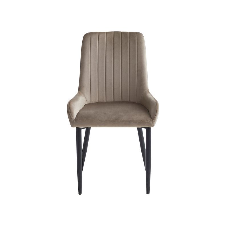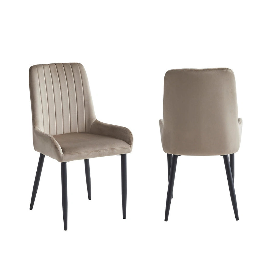 This set of 2 dining chairs features smooth beige velvet upholstery, vertical stitching details for added texture, and sturdy black steel legs for contrast and stability. The neutral tones make it easy to pair with any dining table, while the plush seat offers comfort that lasts through every gathering or casual meal.