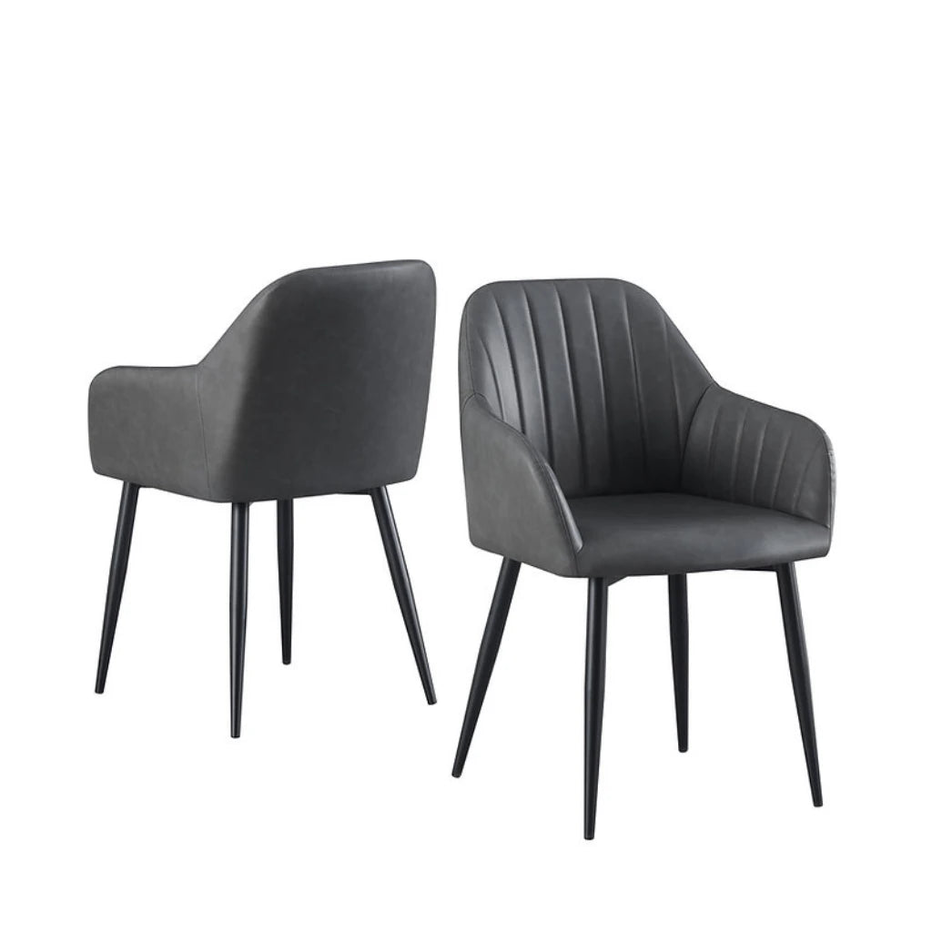 Looking to upgrade your dining space without overthinking it? This set of 2 grey PU dining chairs offers the perfect mix of modern style and everyday comfort. Each chair is upholstered in soft grey faux leather (PU) that feels smooth to the touch and wipes clean in seconds — ideal for busy homes. The integrated armrests give you that little extra support that makes a big difference during long dinners or late-night chats. Elegant vertical channel stitching adds visual depth, while the sleek black tapered steel legs keep things grounded with a touch of contrast. They look high-end. They feel cozy. And they slide seamlessly into almost any decor — minimalist, modern, or even transitional.