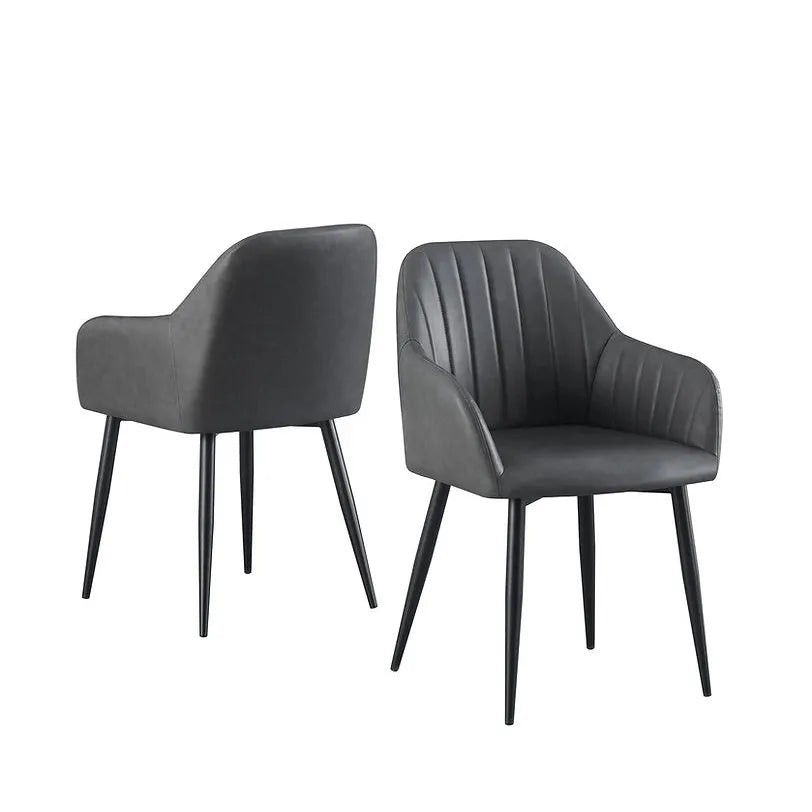 Now the chairs. Wrapped in soft grey PU, they’re easy to clean and incredibly comfortable. Integrated armrests provide that extra bit of support. The vertical channel stitching adds texture and elegance. Tapered black steel legs keep it grounded in style.