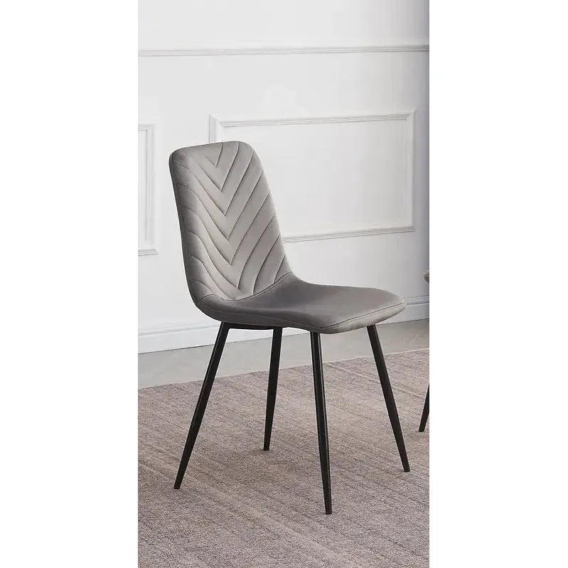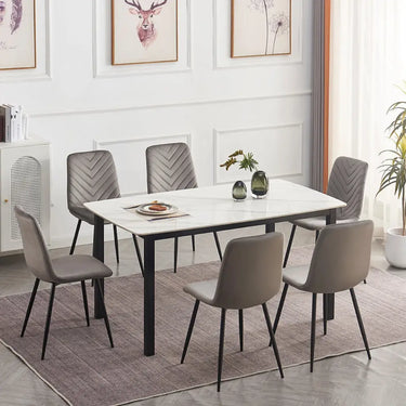Imagine meals that feel more special. This white marble dining set brings that vision to life. At its center is a table with a sintered stone top in rich white marble tones. It has real visual depth. Feels luxurious. And it stands up to everyday use effortlessly. Six grey velvet chairs complete the set. They come with stylish stitching details. They’re soft. Supportive. Built for lingering conversations. Each one sits confidently on black steel legs.