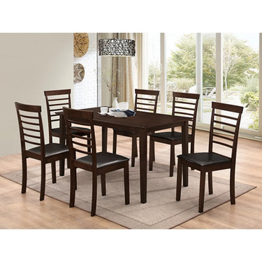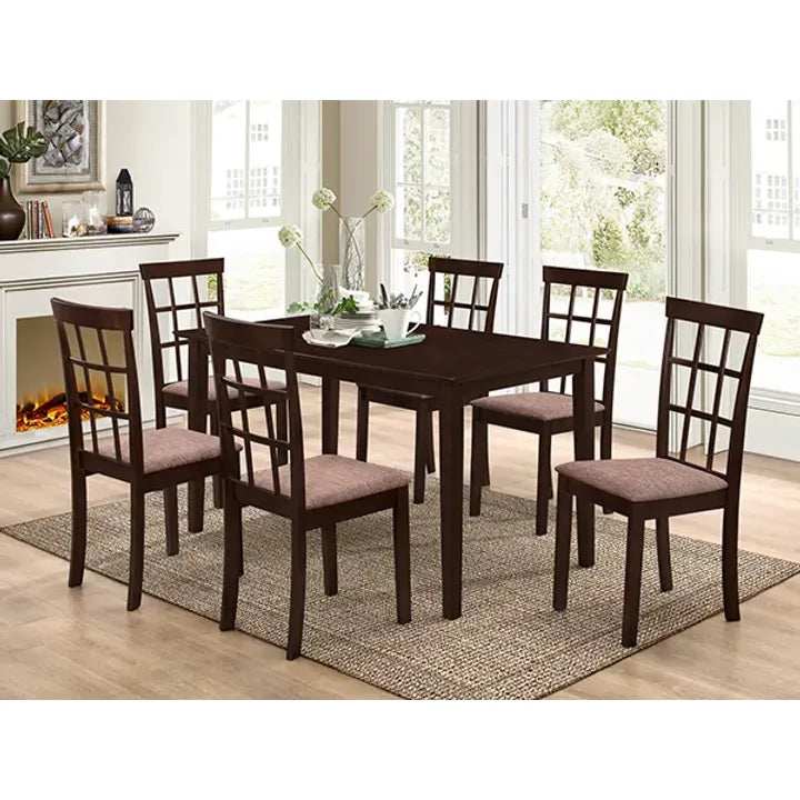 Some dining sets just fill a room with presence. This espresso dining set does exactly that—rich wood tones, timeless design, and the perfect balance of comfort and style. The spacious rectangular table offers plenty of room for family dinners, game nights, or Sunday brunch spreads. Its espresso wood finish adds warmth to your dining area, whether your style leans modern, classic, or somewhere in between. The set comes with six cushioned chairs, available in two beautiful options. Go sleek with black PU cushions for a polished, easy-to-clean surface. Or choose the soft fabric cushions for a cozy, inviting feel. Both feature sturdy espresso-finished legs that tie the look together perfectly.