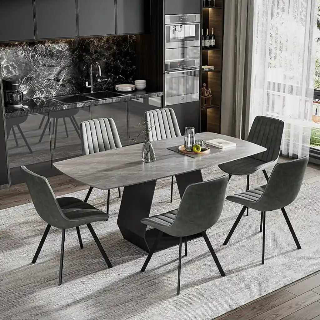 When your dining space needs a glow-up, this grey 7 piece dining set brings the magic. The table? It’s bold. Sophisticated. The sintered stone top has the rich look of Armani grey marble—but with more durability and way less upkeep. It’s smooth, matte, and ready for everything from weekday dinners to weekend guests. Its carbon black steel base keeps things grounded. Sleek and strong. No wobble, no worries.