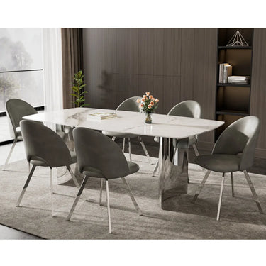 This modern 7 piece dining set is all about elegance without the ego. Clean lines. Luxurious finishes. Just the right amount of shine. The star of the show? That stunning sintered stone tabletop. It gives you the beauty of snow white marble—without the high maintenance. It’s smooth, matte, and feels rich under your fingertips. The stainless steel base adds a polished, architectural edge. It's sleek, strong, and stylish. Pair that with six softly cushioned PU chairs in light grey, and the look is complete.