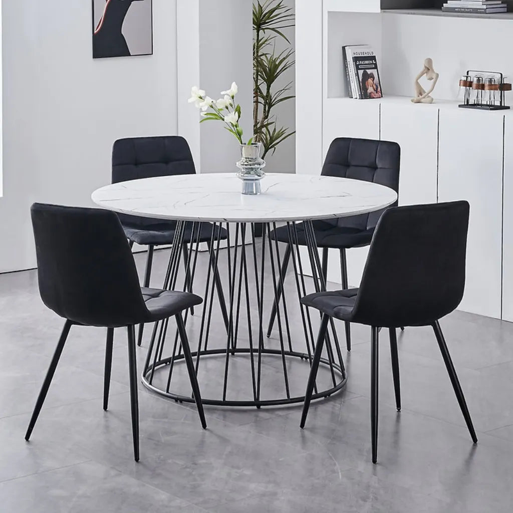 This round 7 piece dining set is a small-space hero with big style. The 48" circular table creates a cozy, conversation-friendly setup—ideal for families or friends gathering over good food. Its white marble veneer top feels luxurious, while the black steel pedestal base adds a modern, grounded contrast. No sharp corners. No wasted space. Just clean, contemporary charm.