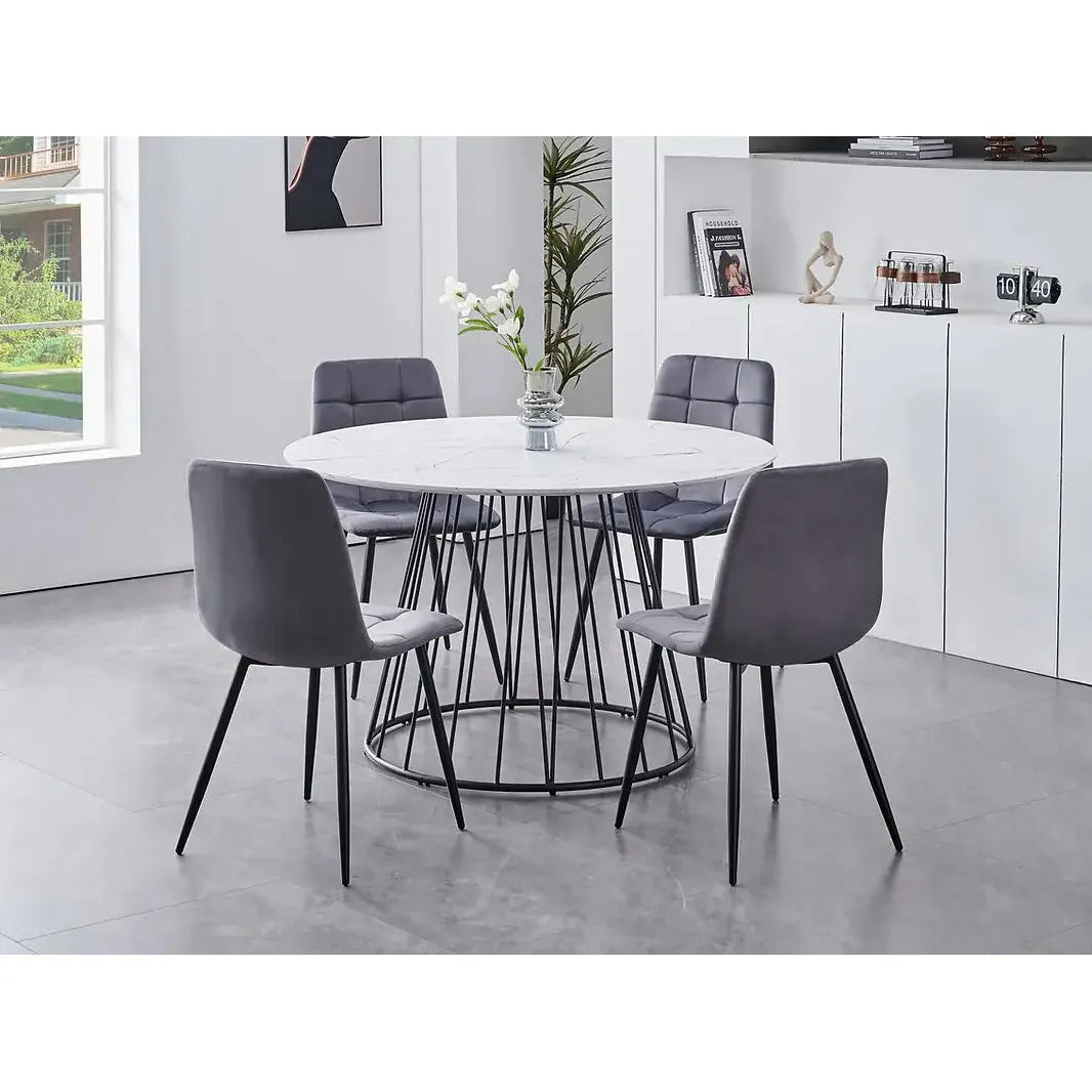 Dining room set with a round white table and gray velvet chairs
