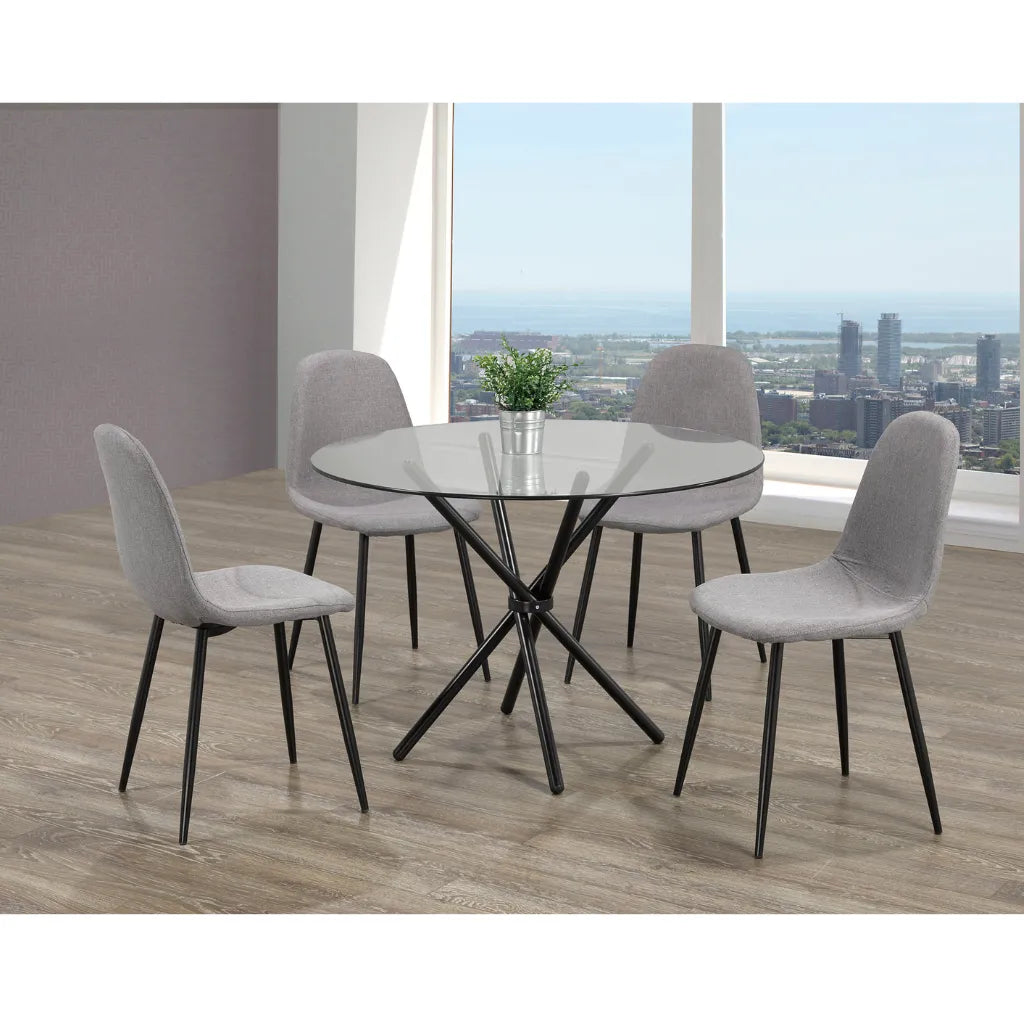 Round Glass Dining Set with Black Base & Grey Fabric Chairs