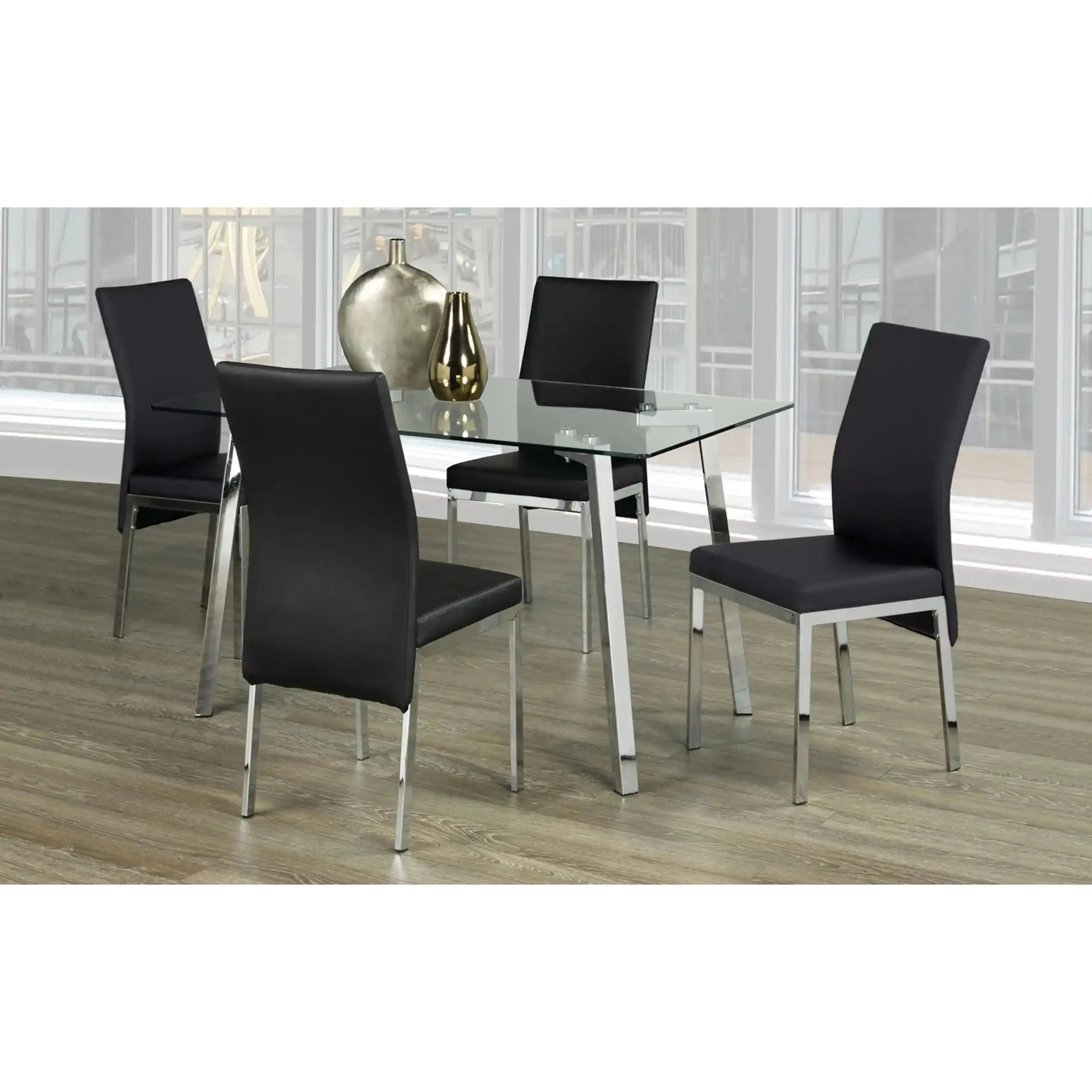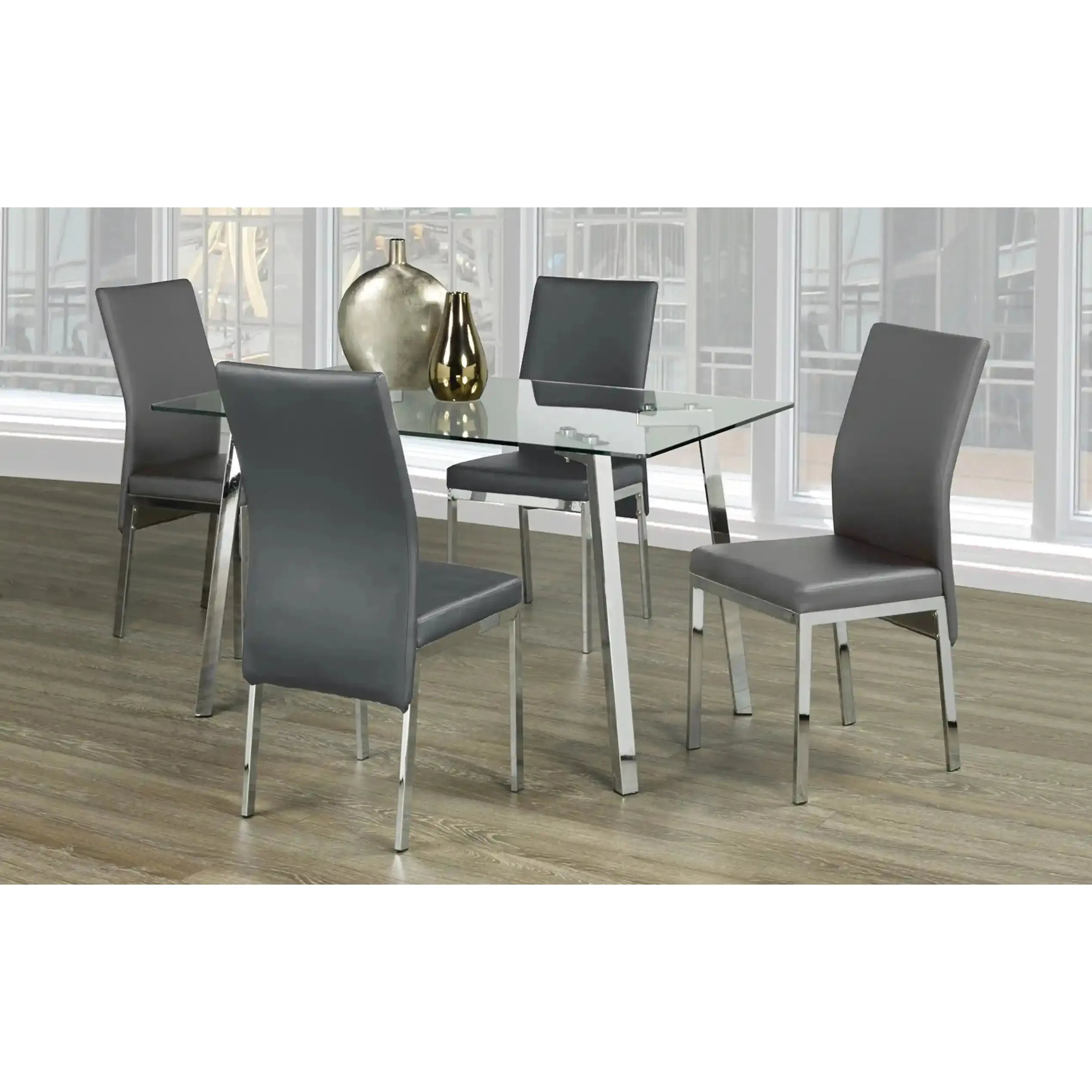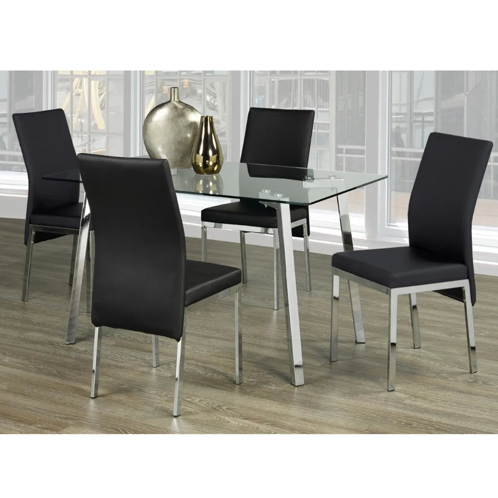 Perfectly tailored for apartments, condos, or modern dining rooms, this 5-piece dining set offers the ideal mix of elegance and everyday function. The clear tempered glass table brings a sleek, airy vibe, while the chrome legs add a polished touch. Choose between black or grey PU chairs to match your style — both options offer comfort and easy maintenance.
