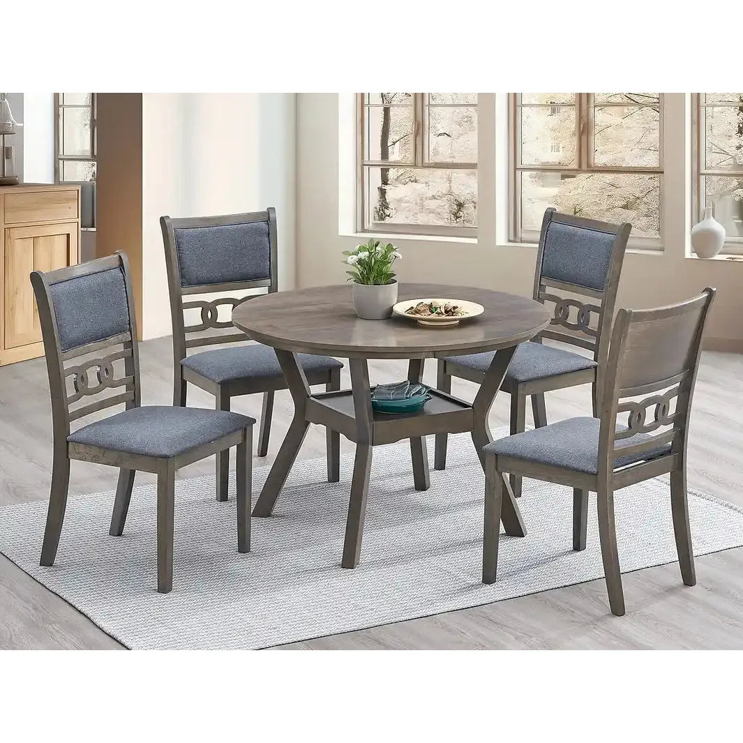 - 5‑piece dining set: includes 1 round table + 4 upholstered chairs