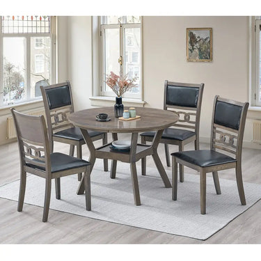 This modern round dining set pairs compact design with luxurious comfort. The round 42″ table brings people together naturally. It’s balanced, inviting, and crafted from durable rubber wood with an antique grey veneer. A low-maintenance surface ready for everyday meals. You get four upholstered cushion chairs—soft, supportive, and built to last. Choose from dark grey fabric or sleek black PU upholstery. Each design includes fine stitching and plush cushioning.
