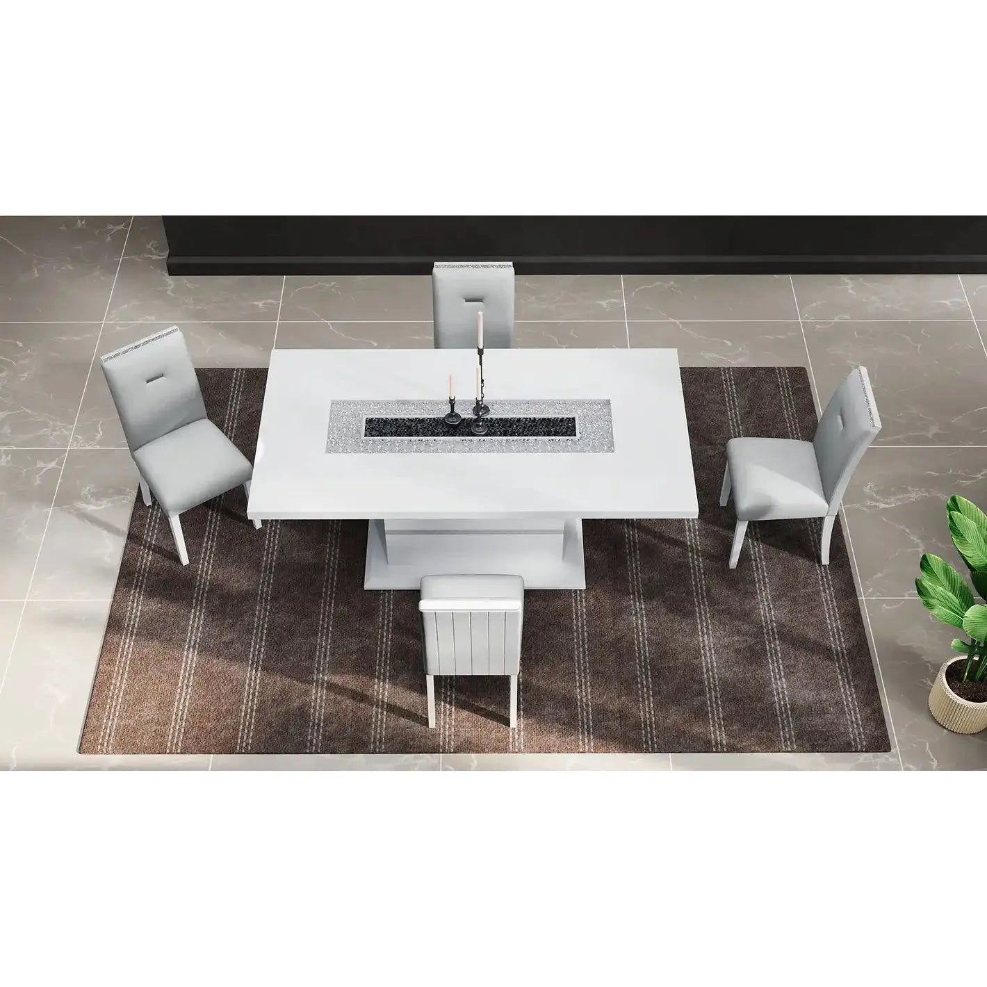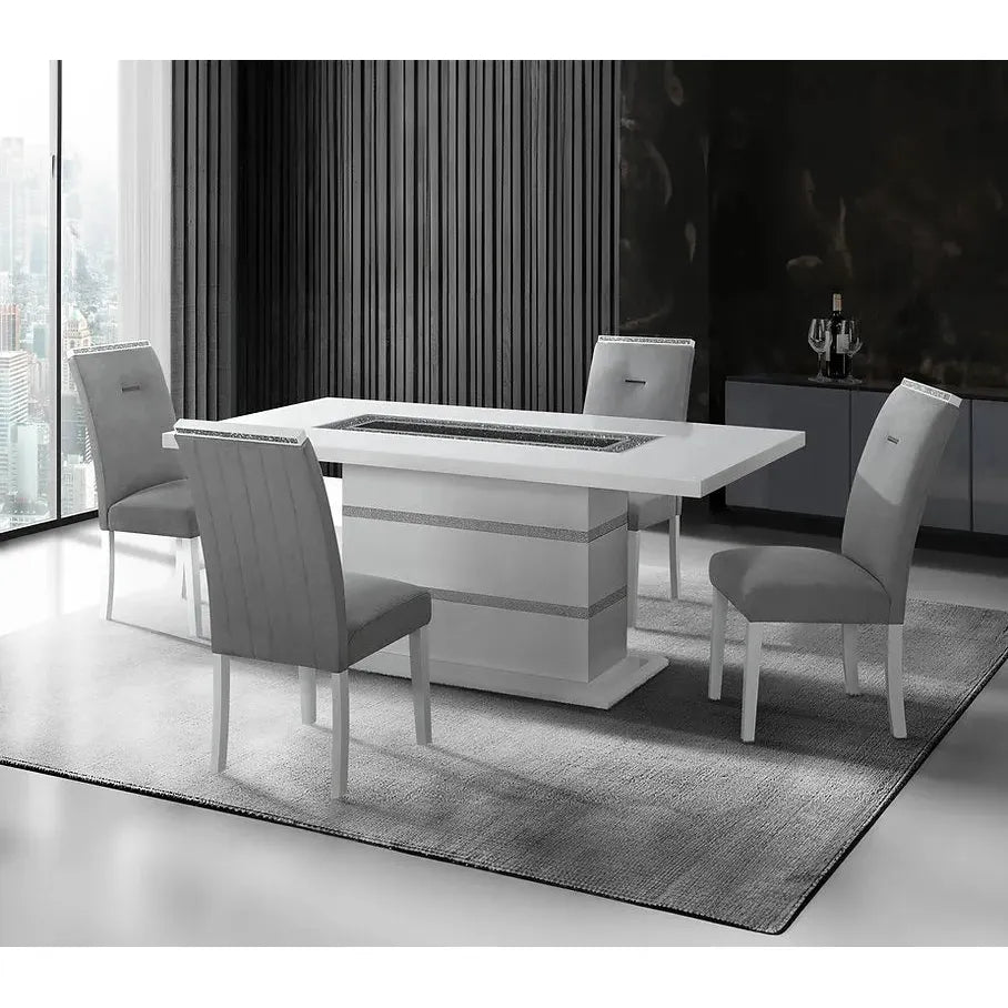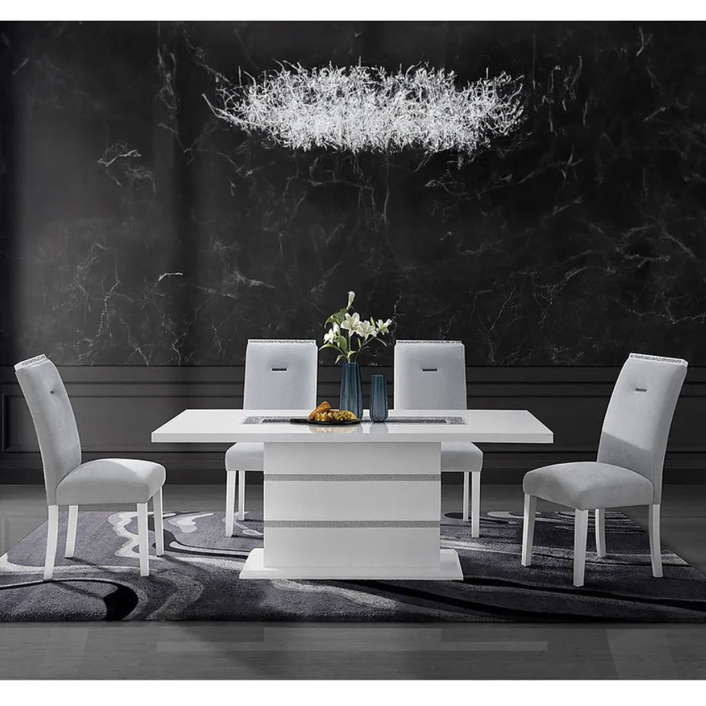 The Monaco modern dining set brings elegance, shine, and comfort together in one unforgettable design. Whether it’s a cozy dinner or a lively gathering, this 7-piece set creates a striking focal point. The table features a bold white high-gloss pedestal base, but what steals the spotlight? That glittering centerpiece. Beneath a sleek glass insert, black and silver beads sparkle—an unexpected detail that draws compliments.