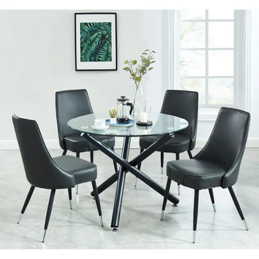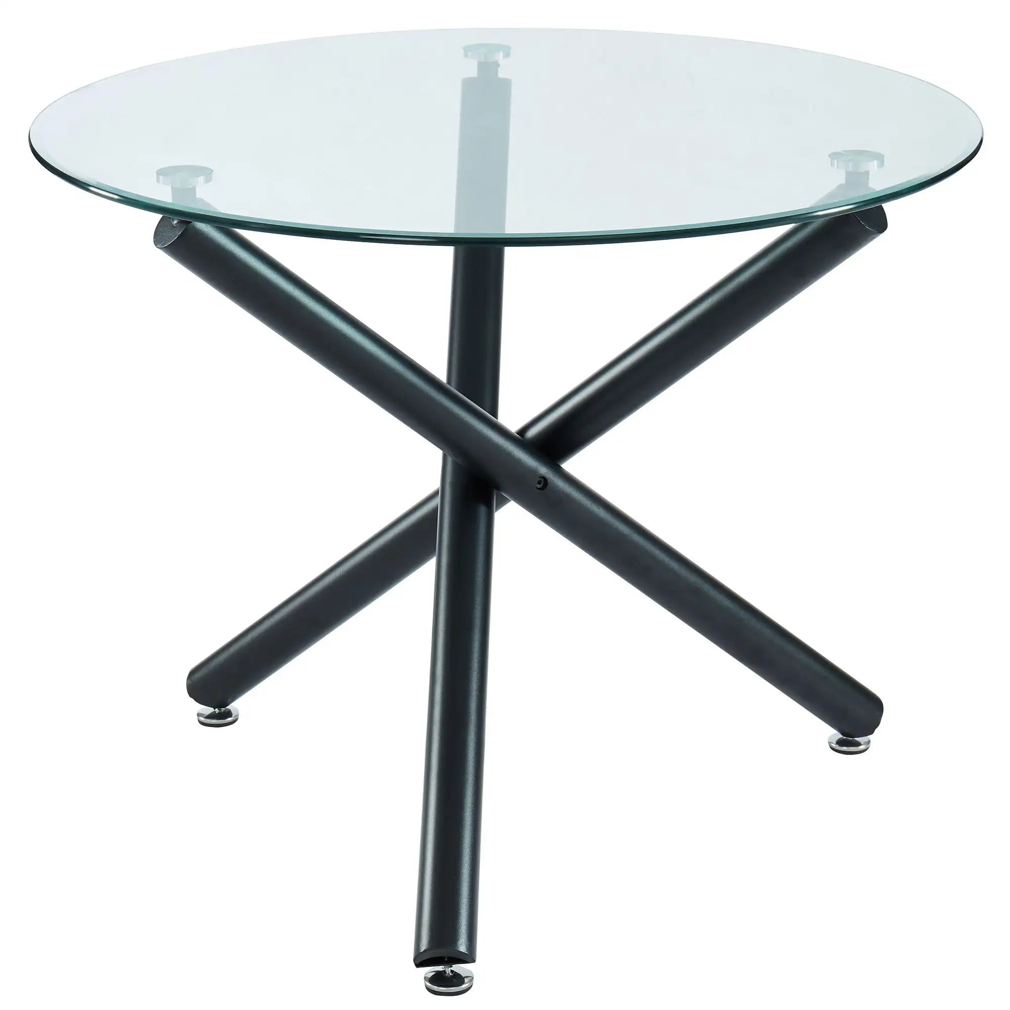 The round dining table is a true standout. Its 10mm clear tempered glass top gives your space a light, airy feel, while the matte black crossover base adds a bold architectural flair. The stainless steel accents lend just the right amount of polish to complete the sophisticated look.