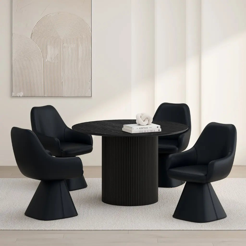 The Tovas/Caprese 5pc Dining Set brings together sleek style and practical luxury. At its heart is a mid-century round pedestal dining table. Its reeded base and reverse-bevel oak veneer top create a piece that’s both sculptural and inviting. The visible wood grain adds a touch of natural warmth, while the black finish sets the perfect modern mood.