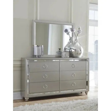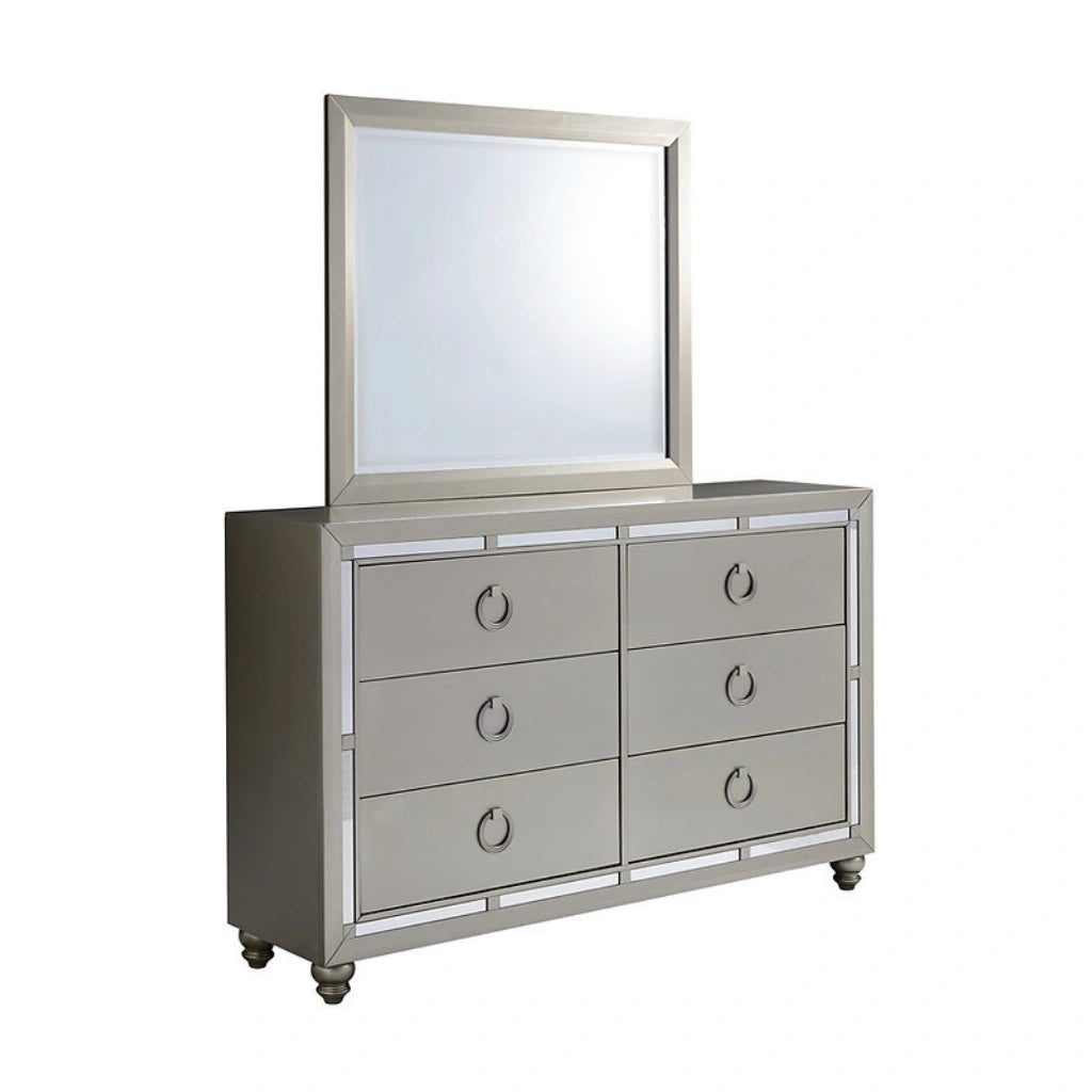 The Luna dresser shines in a sleek silver finish. Contemporary style meets practical storage. Its silver hardware adds a polished, refined touch.