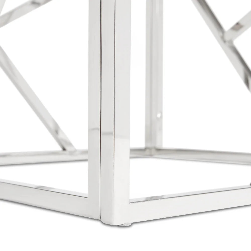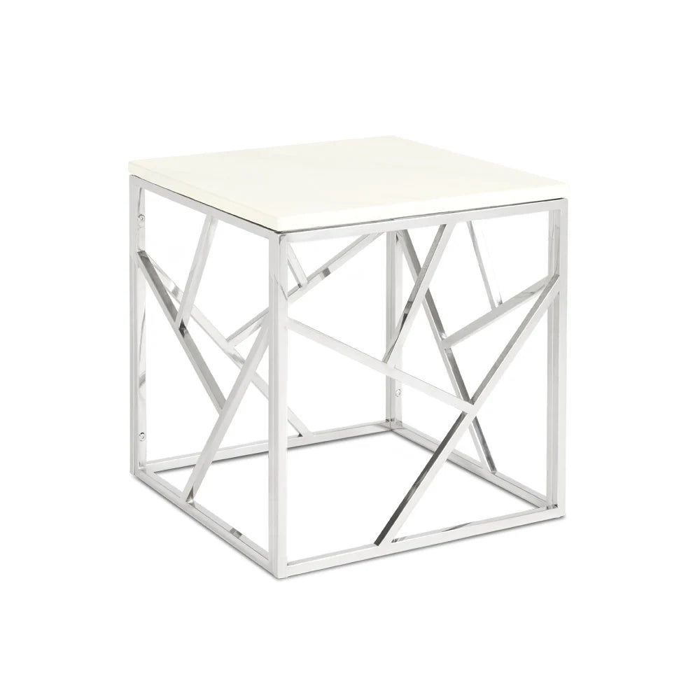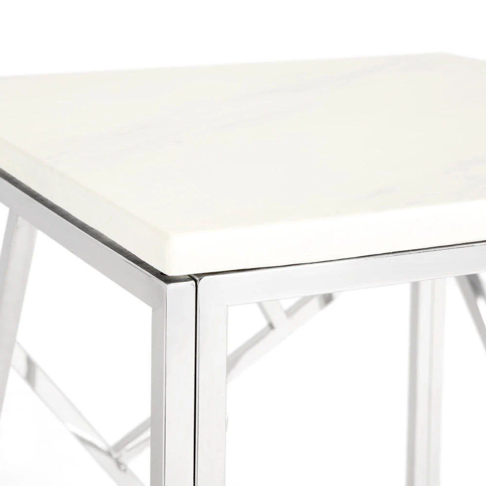 The Carole white marble top end table has a gorgeous faux white marble top and live-edge look, along with a shiny stainless steel frame. This end table brings a high-end, aesthetic feel to the room.