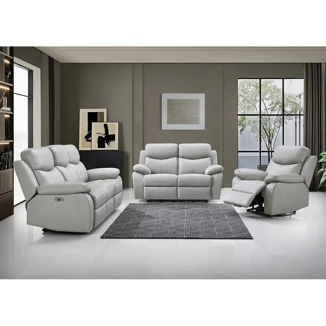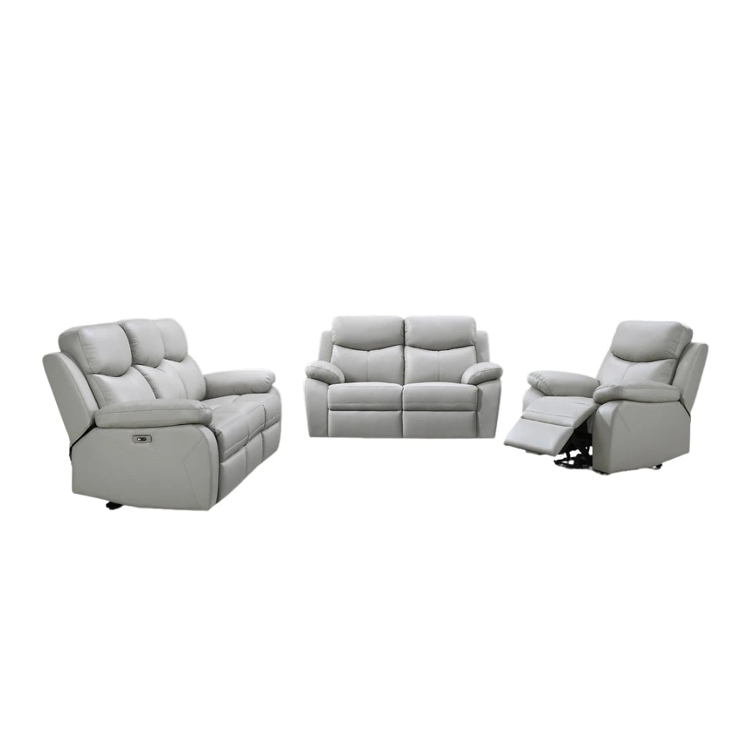 Your living room should feel like a retreat. A space that’s stylish. Cozy. And tailored for the way you live. Meet the ultimate upgrade: this power reclining sofa set in stunning light grey genuine leather match. It’s a trio designed for pure comfort and effortless modern living.