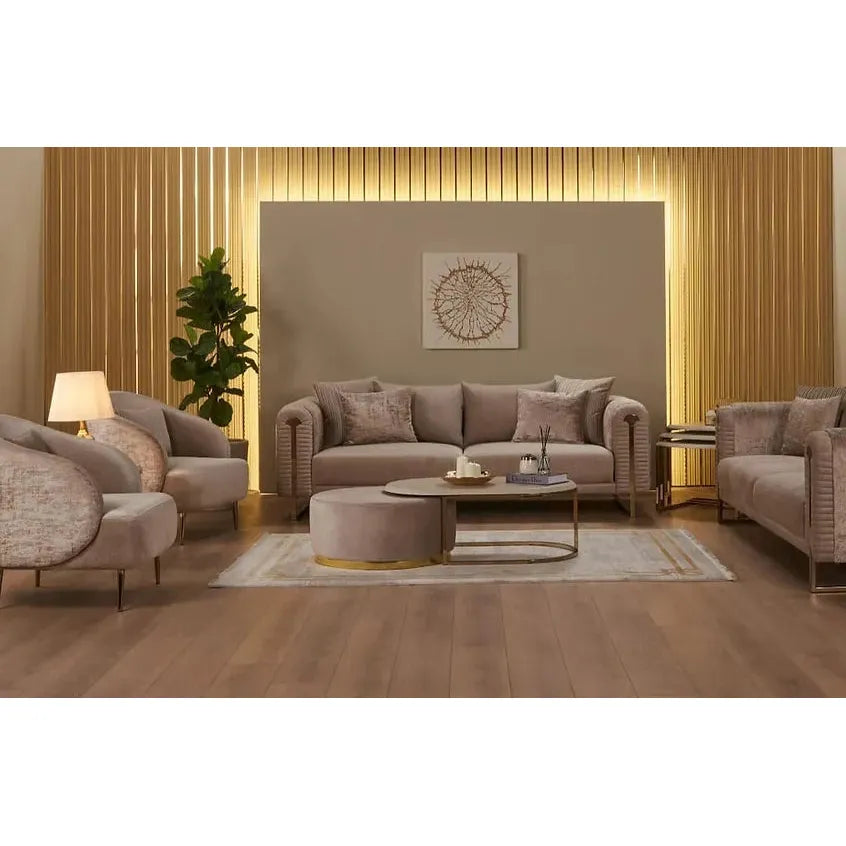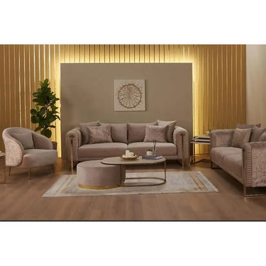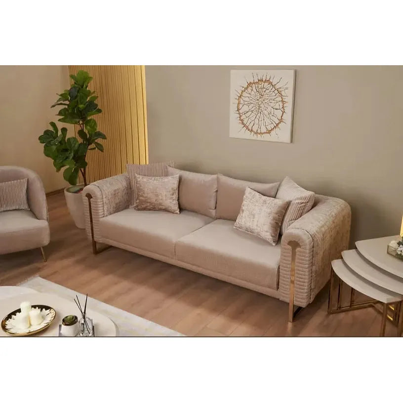 ELIZA Sofa Set – Beige & Gold Fabric Seating with Stainless Steel Legs