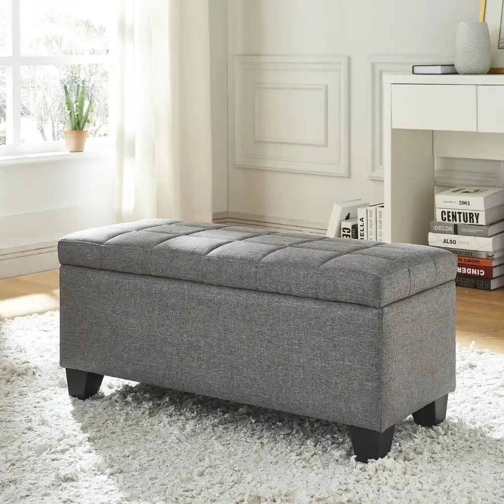 Bring maximum space and a touch of class to any room in your home with the Lila rectangular storage ottoman bench, designed to make a statement while creating added storage to remove clutter. Wrapped in textured fabric, the square tufted top creates a comfortable seat or footrest, while a padded underside is effective for sitting or putting up your feet.