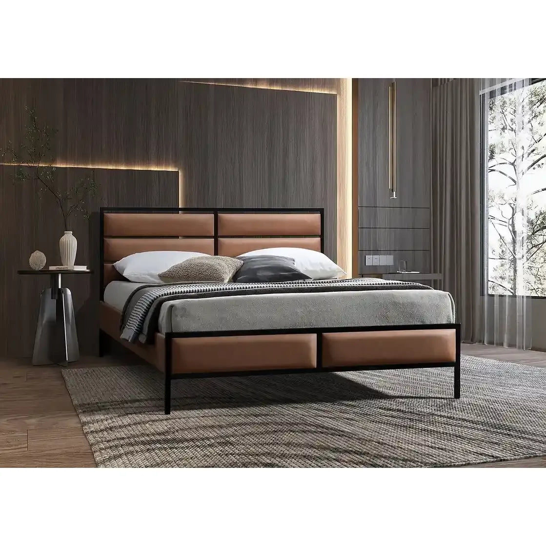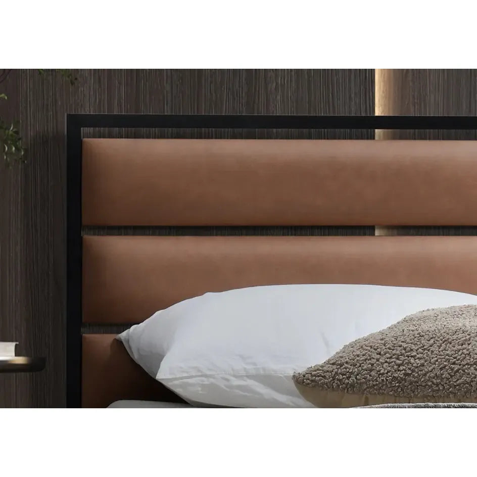 Its industrial-modern design pairs sleek metal framing with luxurious tan PU inserts. The look is bold, yet versatile, fitting both contemporary and loft-style bedrooms.