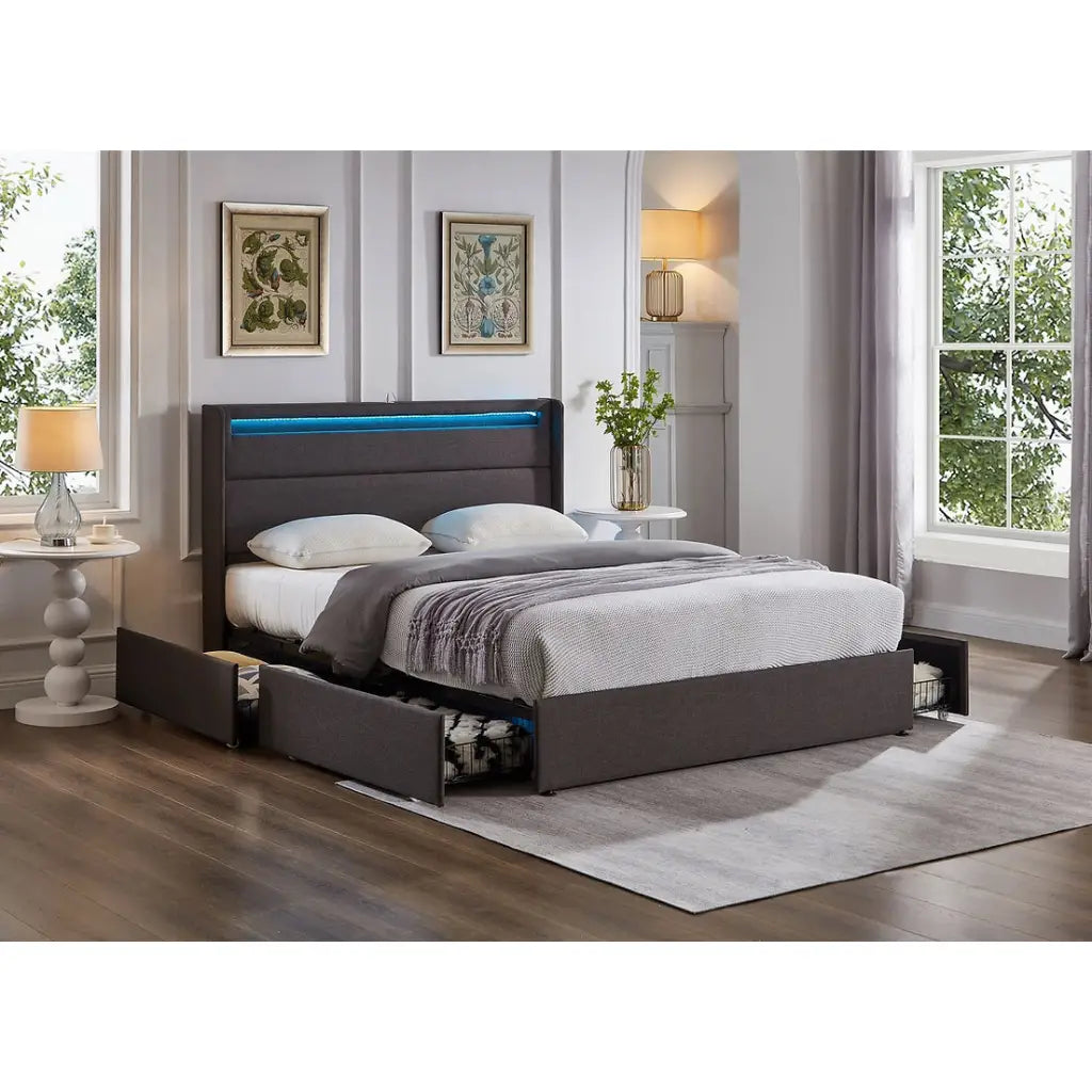 Queen Bed with Storage Drawers, LED Lights & Charging Station