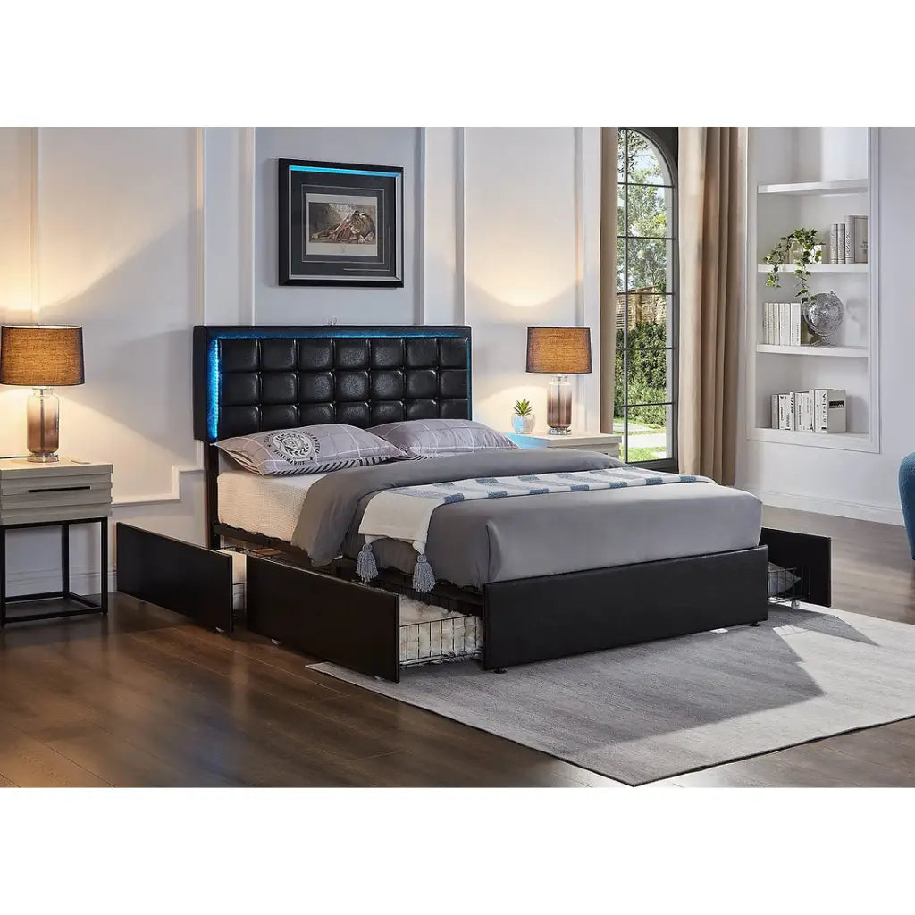 Queen Bed with Storage Drawers, LED Lights & Charging Station