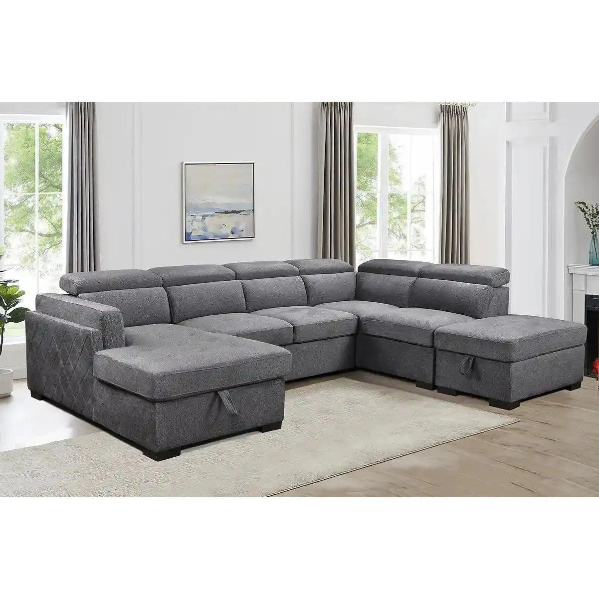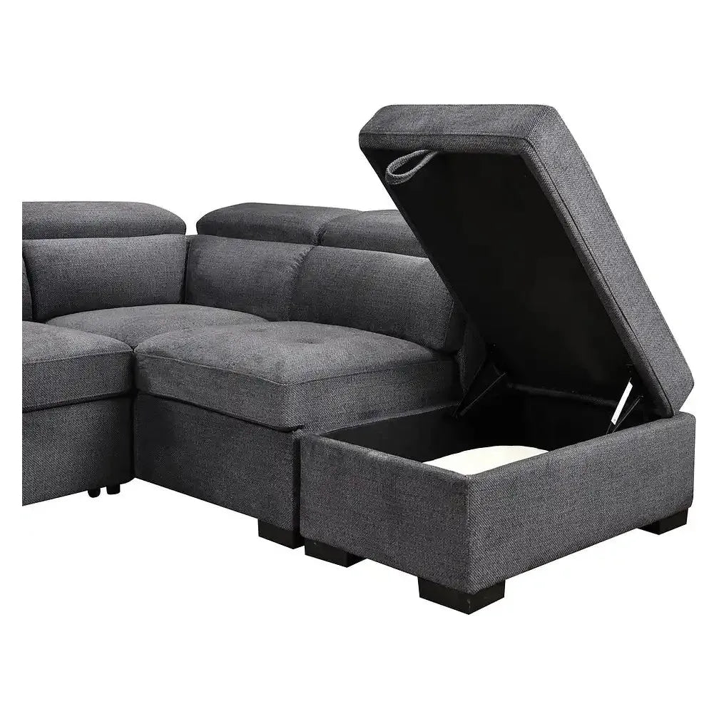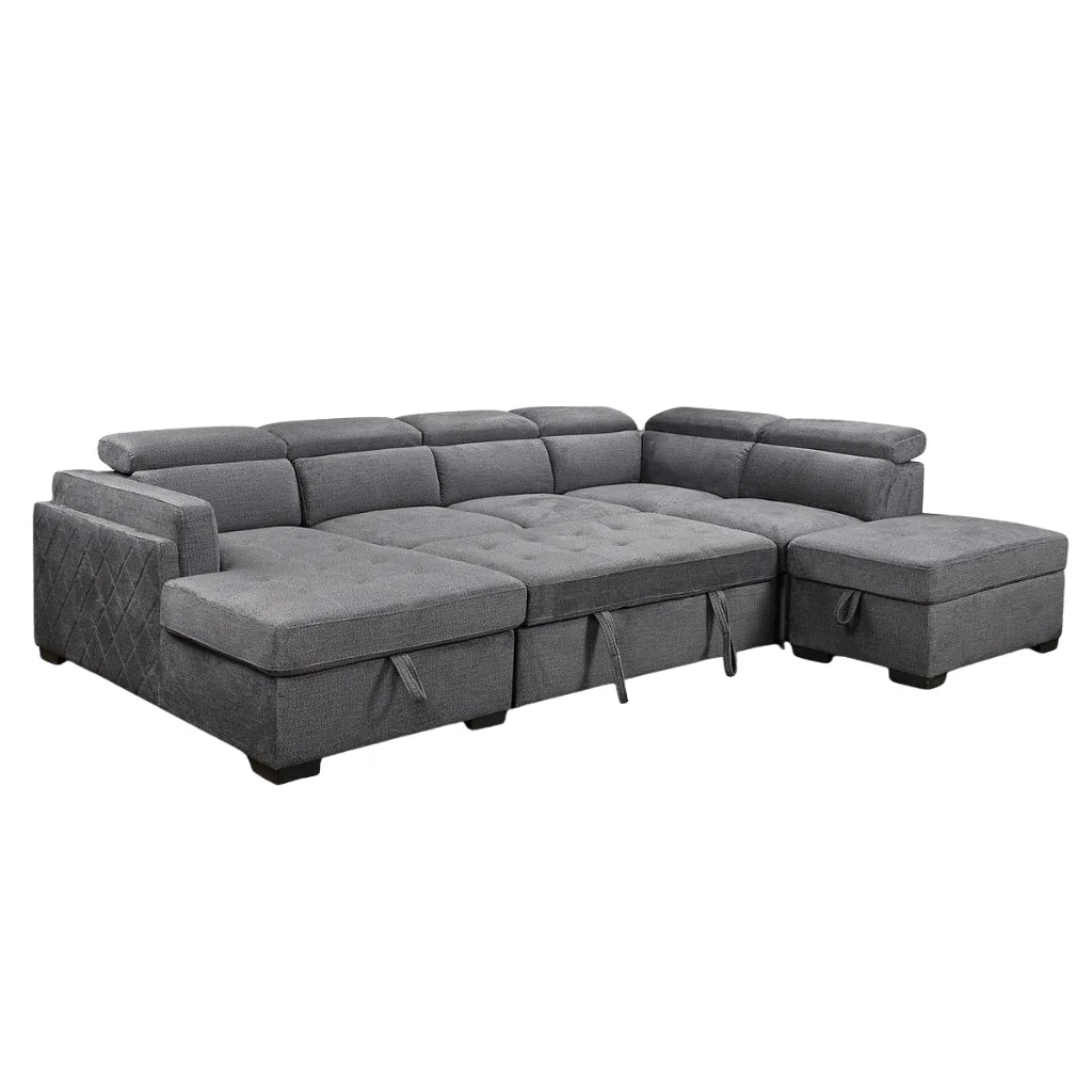 Sectional Sofa Bed with Storage – Grey Fabric & Adjustable Headrests