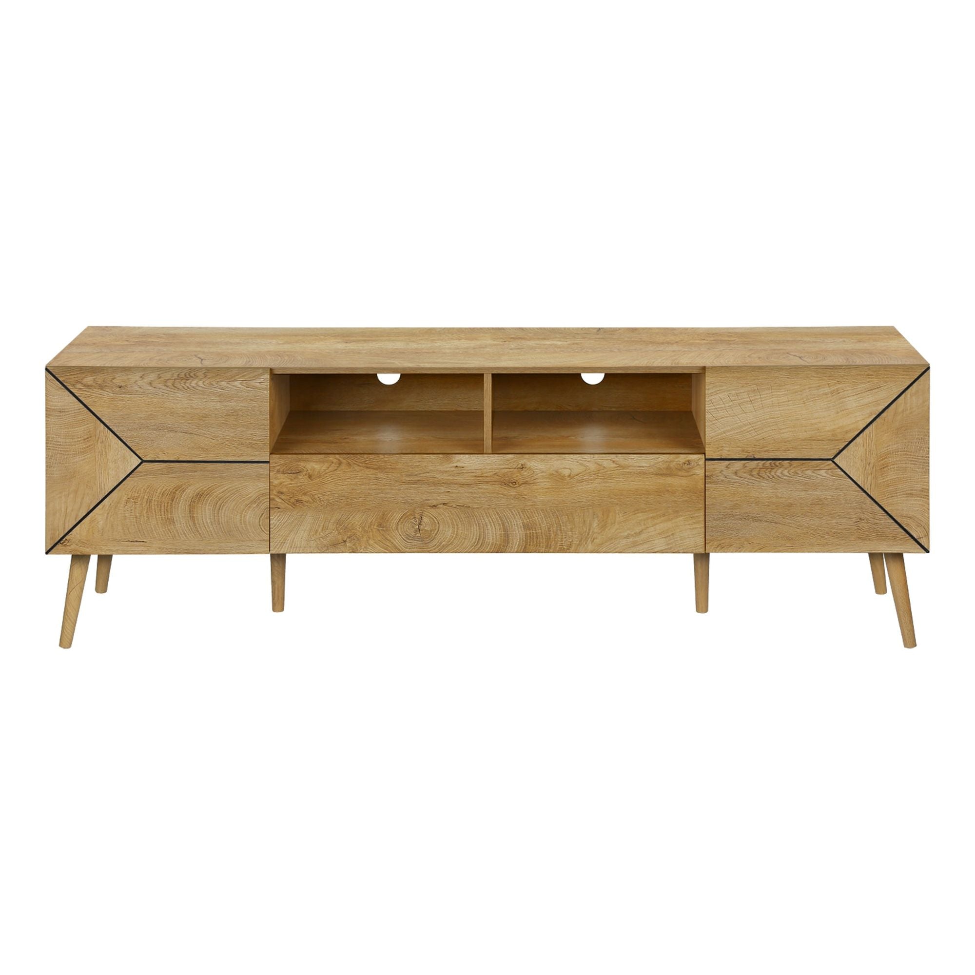 Make a statement in your living room, family room, or bedroom with this trendy 72 inch tv stand in a smooth, light walnut laminate finish with lots of storage. This tv console boasts a mid-century, retro style with solid construction that is both fashionable and functional. Offering plenty of space with 2 open cubbies,1 large easy glide storage drawer and 2 closed cabinets with stylish grooved lines, all to keep your media essentials organized. The 2 cable management holes in the back keeps your cords tidy and out of sight. This durably designed console also features solid wood legs with an easy to clean top for hassle-free maintenance. Easy to assemble with illustrated instructions and all hardware included, this media storage unit will be ready to use in no time. For your convenience, we provide a 5 year limited warranty against any manufacturer defects. Upgrade your media entertainment center with this long-lasting and quality made furniture piece with fashionable style.