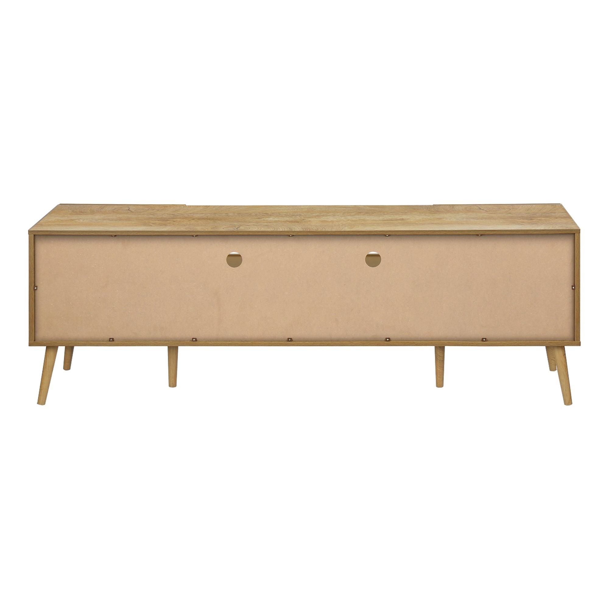 • A highly functional 72 inch tv stand console unit with a smooth, light walnut laminate finish in a mid-century, retro style and abundant storage options.