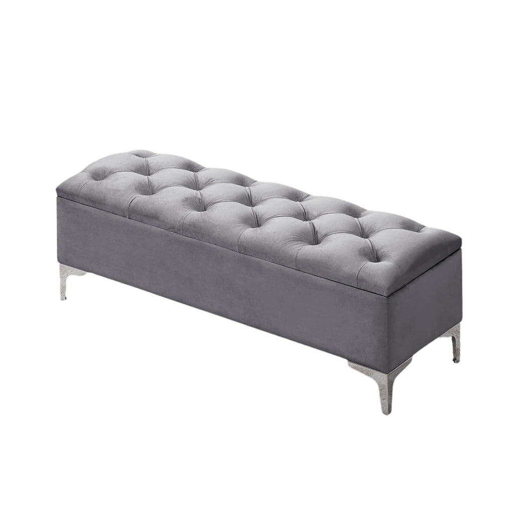 Beautiful and practical. That’s the magic combo. This velvet storage bench delivers both. It's soft, stylish, and surprisingly spacious. The moment you see the tufted velvet seat and shiny chrome legs, you know it’s not just another bench. Lift the top, and voilà—instant hidden storage. Perfect for throws, shoes, or anything you need tucked away. It’s a smart way to stay organized without sacrificing style. Whether you're going for modern, glam, or something in between, this bench fits right in. Grey velvet brings a calm vibe. Black makes a bold statement. Cream? Pure elegance.