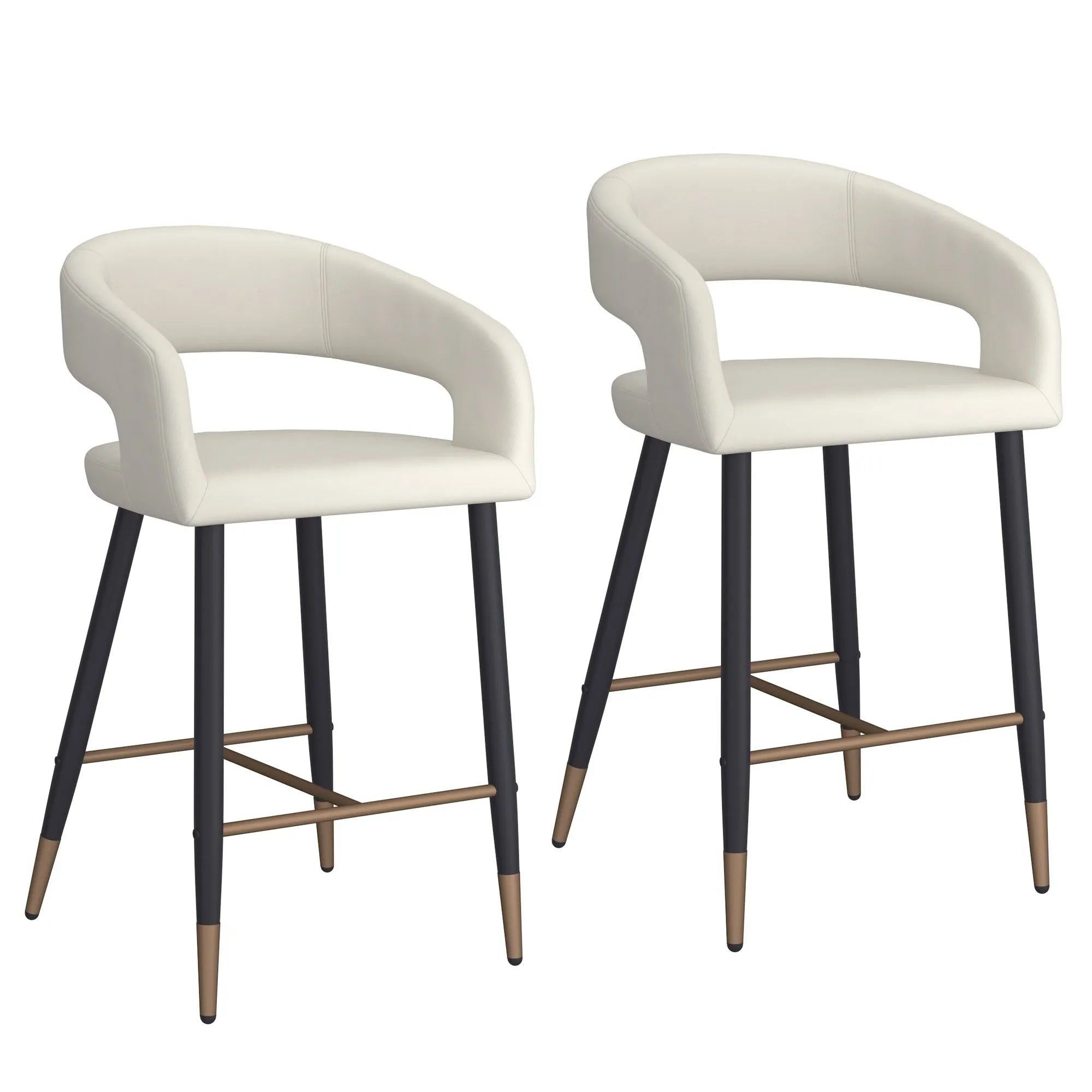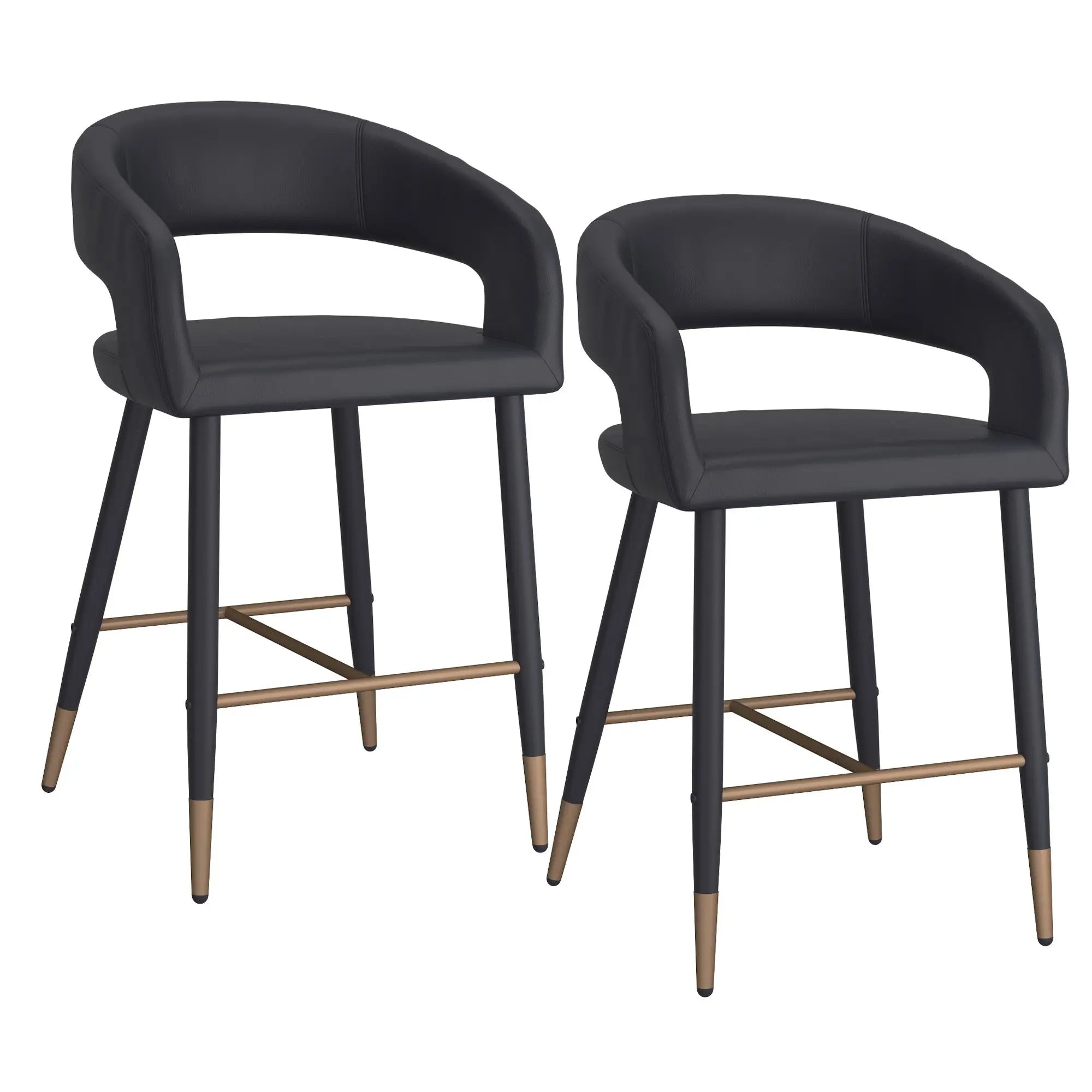 Update your kitchen or bar area with the Baily 26" Modern Counter Height Stools Set of 2. Wrapped in a sleek saddle-toned faux leather and featuring a curved high back, this stool combines luxurious comfort with elegant style. The black metal frame is complemented by aged gold detailing on the legs and footrest, bringing an elevated look to any room.