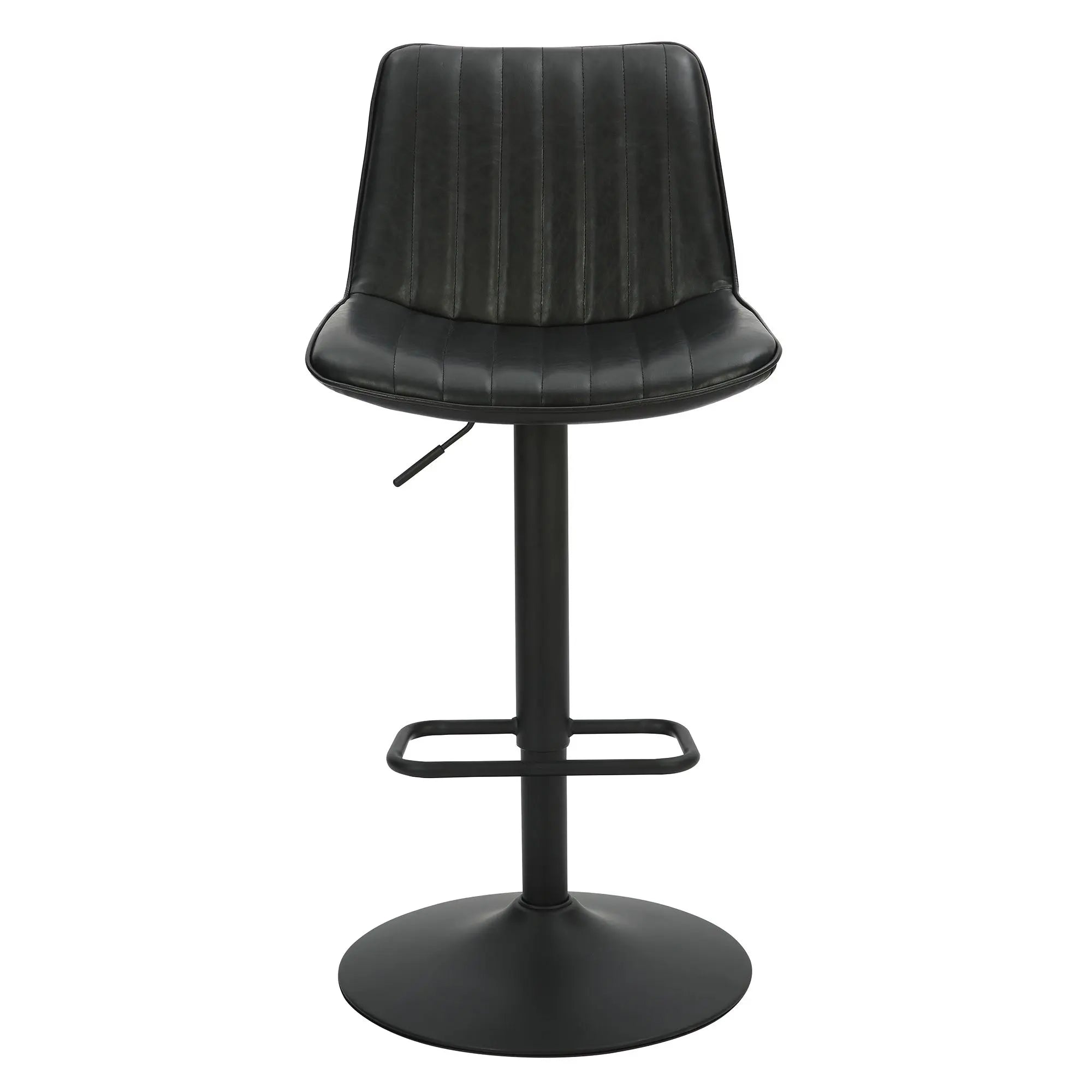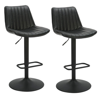 Elevate your kitchen island or home bar with the Kosi Adjustable Bar stool set of 2, the ideal combination of style, comfort, and versatility. Upholstered in a vintage style with vertical tufting, the leather–look fabric is easy to clean and is not just gorgeous to look at but also a dream to maintain; these stools have a full 360° swivel and a gas lift; they easily and infinitely adjust from counter height to bar height anywhere between 26.75" to 33" with a hydraulic system that attaches right to the seat.