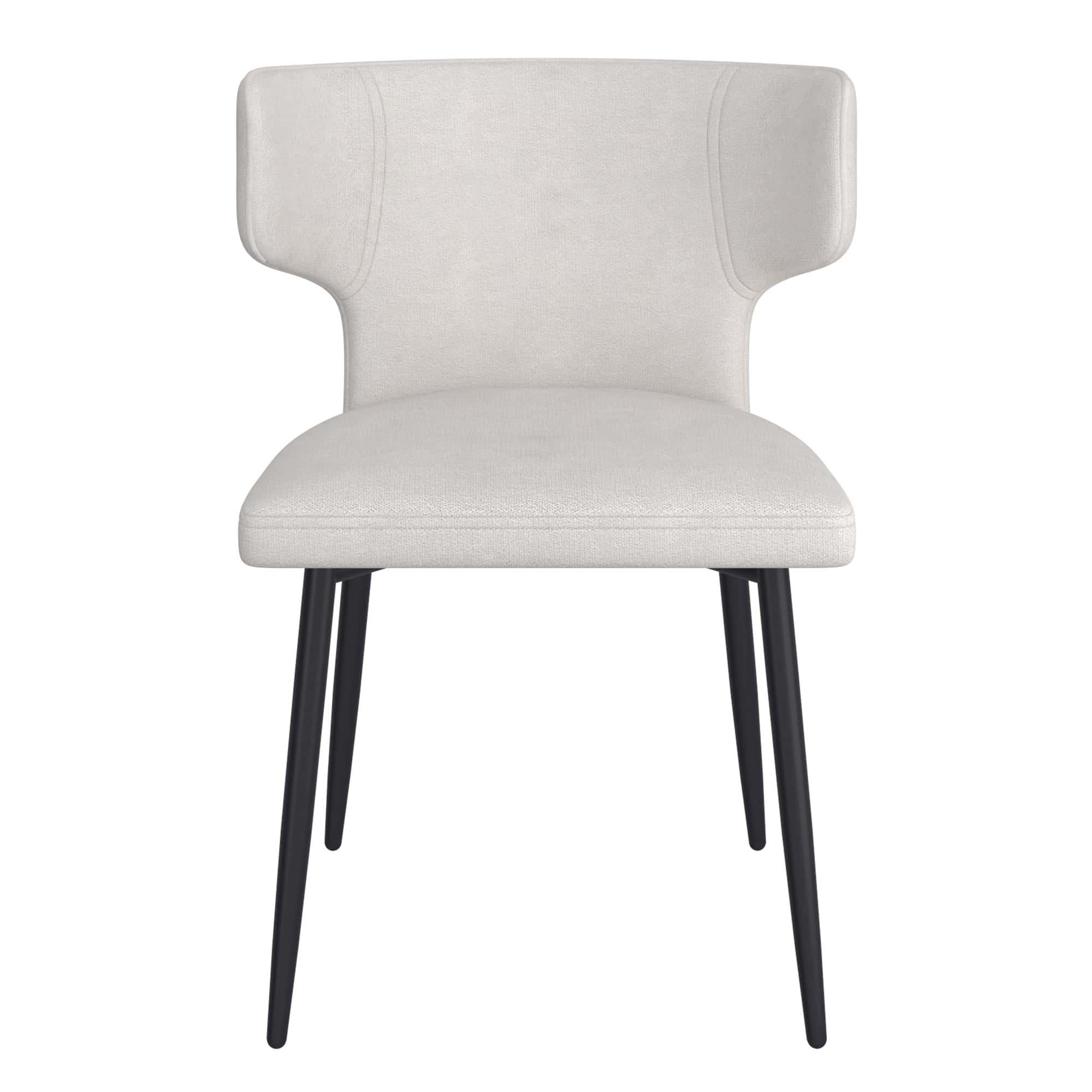 Add a designer touch to your dining room with these beautiful, curved back and cushioned seat comfortable beige dining chairs. The modern wingback design give your room a high-quality stylish look.  Fabric upholstery is easy to wipe clean. The black metal legs are fit for any space. This chair is Perfect for formal dining spaces, or to kick up your everyday dining experience and pair it with your casual kitchen table.
