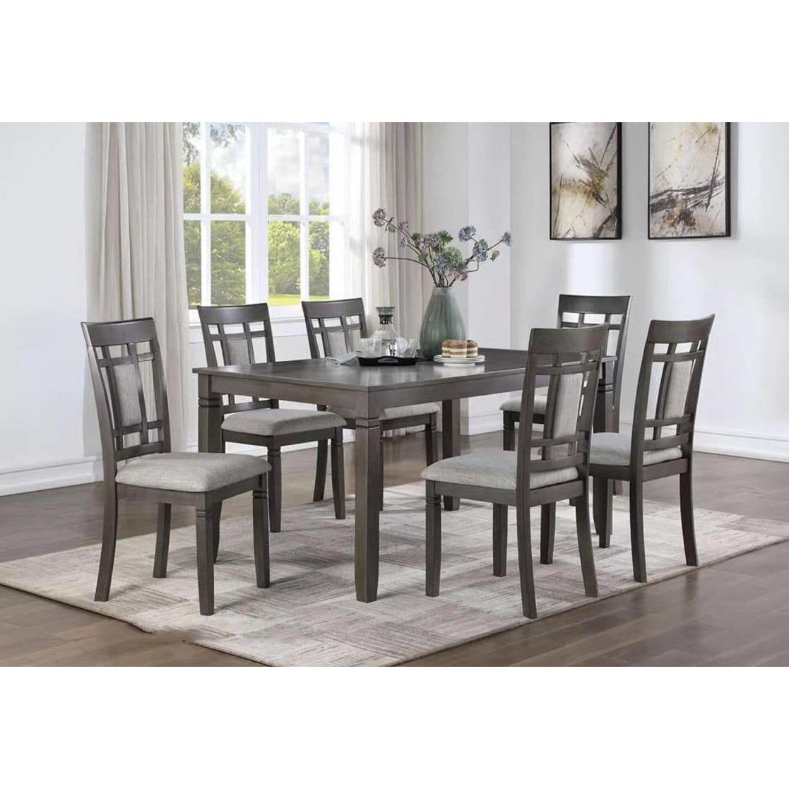 Decorate your dining space with the Aaron 7 PC Contemporary Dining Set. This dining set comes with a wood table and six upholstered chairs. This dining set ensures both style and comfort. The 7-piece dining room set is Perfect for family meals, gatherings, and special occasions.