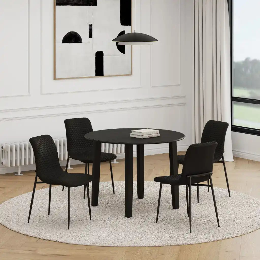 At the center of this set is a beautiful 42" round drop-leaf table, designed for your convenience. Eight inches of extra surface space per leaf makes it simple to move from small, intimate dinners to lively family gatherings. The look of the black engineered wood tabletop, including all its grain, creates a warm, sophisticated atmosphere, while the solid rubberwood legs provide excellent stability over time.