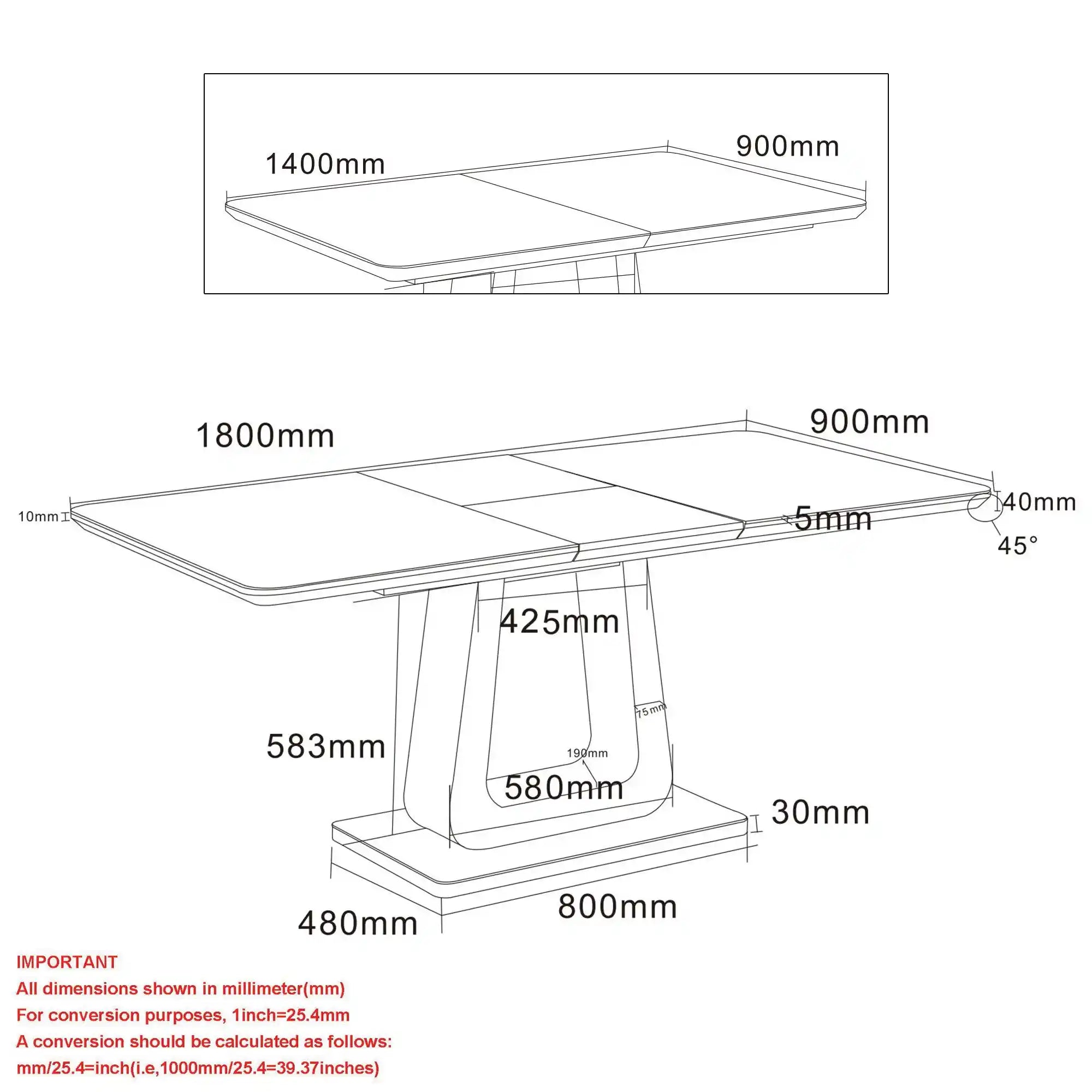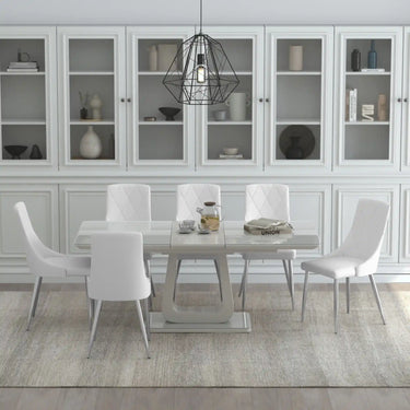 Central to this set is a fashionable warm grey tempered glass dining table, a sleek and stylish high-gloss finish will provide an opulent, contemporary look, without the Italian price tag. Now hosting a dinner party or entertaining a couple more guests is even a breeze with the single-handed extension operation, simply slide out the two end leaves and your table goes from 6 to 12 seat setting in seconds. The eye-catching two-tone color effect, when extended, will make your dining area truly unique.