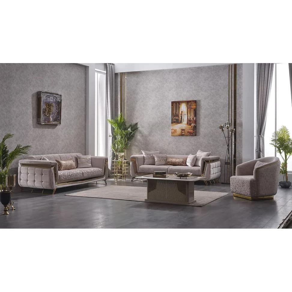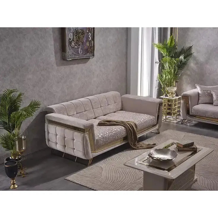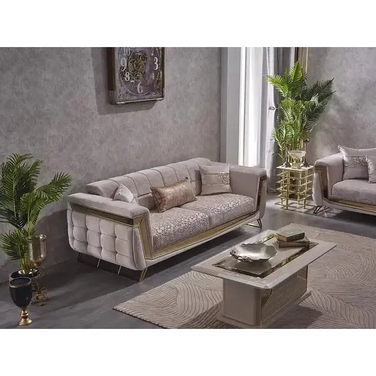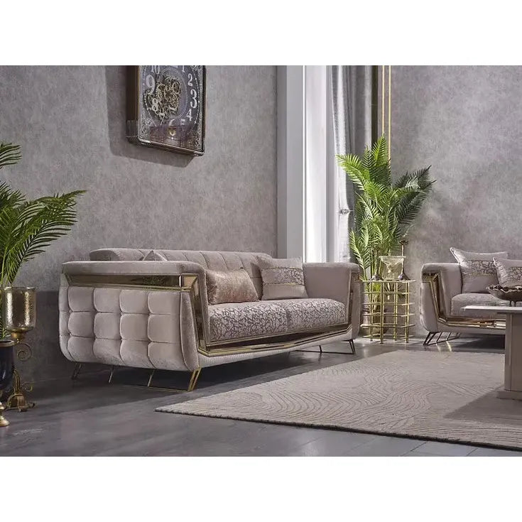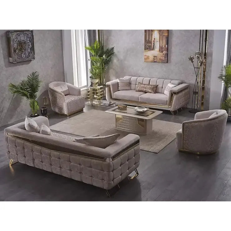 Decorate your living room with the beige and gold velvet MAXIMO Sofa Set.